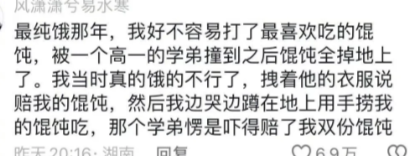 边哭边蹲在地上捞我的馄饨吃,那个学弟愣是吓得赔了我双份馄饨