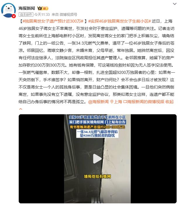 独居离世女子遗产预计近300万蒋女士猝然离世,留下近300万遗产,却因无法定继承人陷入困境。她生前独居,父母早逝、未婚未育,病倒时无人签字抢救。这背后是超9200万独居者的隐忧。人生充满变数,谁都无法预料意外何时降临。独居者们,别再拖延,尽早做好财务和监护安排,别让身后事成遗憾。