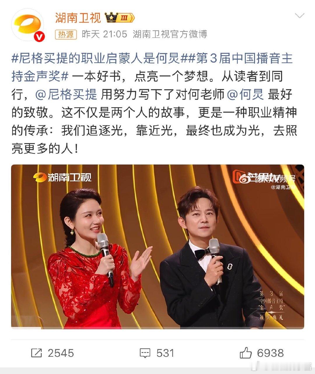 尼格买提的职业启蒙人是何炅第3届中国播音主持金声奖因为一本书,遇见一束光。将老师的启蒙化作前行动力,用专业成长书写最美的致敬。这不仅是个人成长,更是行业精神的温暖延续。