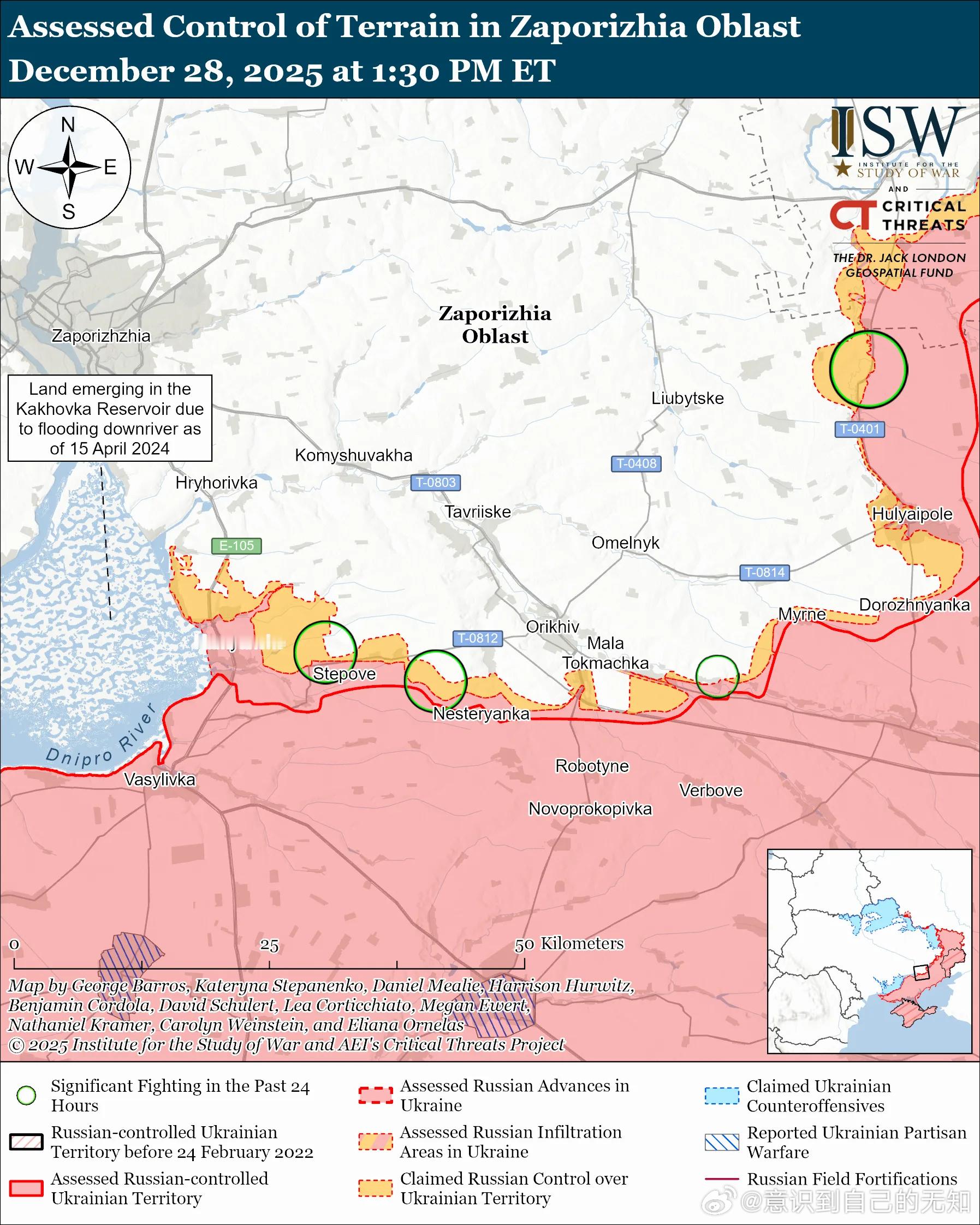 南方轴心俄军目标:守住前线阵地,确保后方免受乌克兰军队袭击,并推进至扎波罗热市的火炮射程之内。俄军最近向胡利亚波列方向推进。未经证实的说法:一位俄罗斯军事博主声称,俄军向胡利亚波列以西推进。12月27日和28日俄军在胡利亚伊波列附近及境内发动进攻;在胡利亚伊波列西北方向的捷尔努瓦特和科索夫采韦发动进攻;在胡利亚伊波列北部的多布罗皮利亚和新扎波罗热附近发动进攻;在胡利亚伊波列东北方向的索洛德克、普里维尔内和雷布内附近发动进攻;在胡利亚伊波列南部的多罗日尼扬卡附近发动进攻。作战序列:俄方官员声称,俄军第57和第60摩步旅(隶属东部军区第5合成集团军[CAA])、第114摩步团(隶属第5合成集团军第127摩步师)以及第38摩步旅(隶属东部军区第35合成集团军[CAA])占领了胡利亚伊波列。一位俄罗斯军事博主还称,俄军第305炮兵旅(隶属第5合成集团军[CAA])和第14特种部队旅(隶属俄罗斯总参谋部情报总局[GRU])在对胡利亚伊波列的地面作战中为俄军提供了火力支援。他们袭击了位于上特尔萨(胡利亚伊波列西北部)和希尔克(胡利亚伊波列西部)附近的乌克兰军队。12月28日俄军继续在扎波罗热州西部发动进攻,但并未取得确切进展。未经证实的说法:俄罗斯国防部声称俄军占领了斯捷普诺戈尔斯克(奥里希夫以西)。俄罗斯国防部长别洛乌索夫将斯捷普诺戈尔斯克的占领归功于俄第247空降团(第7空降师)。一位俄罗斯军事博主声称,俄军向卢基尼奥夫斯克(奥里希夫西北部)西北方向推进,并沿着E-105瓦西里夫卡-卡缅斯克公路向斯捷普诺戈尔斯克西北方向推进。12月27日和28日,俄军在奥里希夫东南方向的马拉托克马奇卡和比洛希尔耶附近、奥里希夫以西的谢尔巴基、斯捷波韦、新安德里夫卡、斯捷普诺戈尔斯克和普里莫尔斯克附近以及奥里希夫西北方向的卢基亚尼夫斯克附近发动了进攻。一位俄罗斯军事博主声称,乌克兰军队在普里莫尔斯克附近进行了反击。乌克兰南方防卫军于 12 月 27 日承认,俄军正试图渗透到斯捷普诺戈尔斯克,并且该定居点正在发生激烈的战斗,但指出乌克兰军队控制着斯捷普诺戈尔斯克的部分地区,这与俄罗斯的说法相反。作战序列:据报道俄第7空降师在普里莫尔斯克附近以及诺沃亚科夫利夫卡和诺沃博伊基夫斯克(均位于奥里希夫西北部)方向展开行动。第7空降师第108空降团和第162独立侦察营在扎波罗热方向(包括普里莫尔斯克附近)展开行动。第4军事基地(南部军区第58集团军)的无人机操作员在奥里希夫方向拦截乌克兰无人机。第 291 摩步团(第 42 摩步师,第 58 集团军)第 3 突击连“涅梅茨”小组正在扎波罗热方向活动,包括在诺沃达尼利夫卡(奥里希夫以南)附近。国际原子能机构(IAEA)总干事拉斐尔·格罗西于12月28日报告称,国际原子能机构促成乌克兰和俄罗斯达成一项为期数天的局部停火协议,以恢复扎波罗热核电站(ZNPP)和扎波罗热火电站(ZTPP)开关站之间的电力传输。国际原子能机构此前曾在2025年10月和11月促成扎波罗热核电站附近的临时停火,以进行类似的维修。12月28日俄军继续向赫尔松方向发起进攻,但并未取得进展。12月27日和28日,俄军从赫尔松市以东向安东尼夫斯基桥发动进攻。作战序列:据报道俄第98空降师的无人机操作员正在第聂伯河西岸(左岸)拦截乌克兰无人机并清除道路上的地雷。12月27日至28日夜间,乌克兰继续对被占领的克里米亚境内的俄罗斯军事基础设施发动中程打击。 乌克兰总参谋部报告称,乌克兰军队袭击了位于被占领的克里米亚切尔诺莫尔斯克附近的一处俄罗斯海军无人机储存和维护基地。乌克兰无人系统部队(USF)指挥官罗伯特·“马扎尔”·布罗夫迪少校发布了一段后来被定位的视频,并报告称乌克兰军队袭击了位于被占领的切尔诺莫尔斯克附近的瓦尔代雷达站,该雷达站是雷达侦察系统的控制点,也是储存和发射海军无人机的基地。