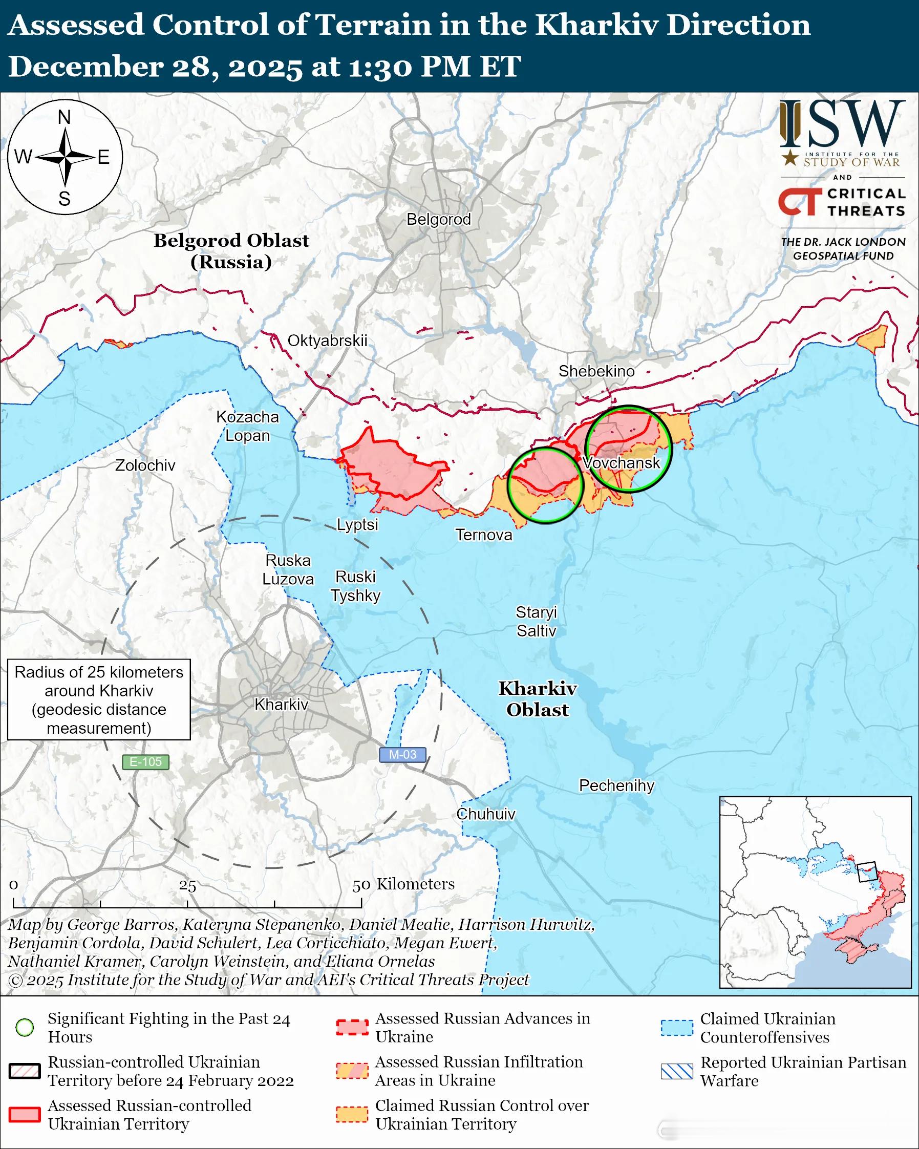 俄罗斯主要行动:乌克兰东部俄军主要行动1俄罗斯的目标:将乌克兰军队从与别尔哥罗德州接壤的国际边界击退,并进入哈尔科夫市的火炮射程之内。12月28日俄军继续在哈尔科夫州北部发动进攻,但并未取得进展。12月27日和28日,俄军在哈尔科夫市东北部的普里利普卡、沃夫昌斯基胡托里、斯塔里察、维尔恰、沃夫昌斯克、伊兹比茨克和莱曼附近以及向西米尼夫卡方向发动进攻。一位俄罗斯军事博主声称,乌克兰军队在维尔恰附近进行了反击。作战序列:据报道俄第7摩步团(第11军,列宁格勒军区)的无人机操作员正在哈尔科夫州打击乌克兰阵地。第245和第347摩步团(均隶属于第47坦克师,近卫坦克集团军,莫斯科军区)的(FPV)无人机操作员正在打击索斯尼夫卡(哈尔科夫市西北部)附近的乌克兰阵地。12月27日俄军继续在韦利基布尔卢克方向发动进攻,但并未取得确切进展。未经证实的说法:一位俄罗斯军事博主声称,俄军向德沃里昌斯克(大布尔鲁克东南)以南推进。12月26日和27日,俄军从韦利基布尔卢克以东向格里戈里夫卡方向发动进攻。