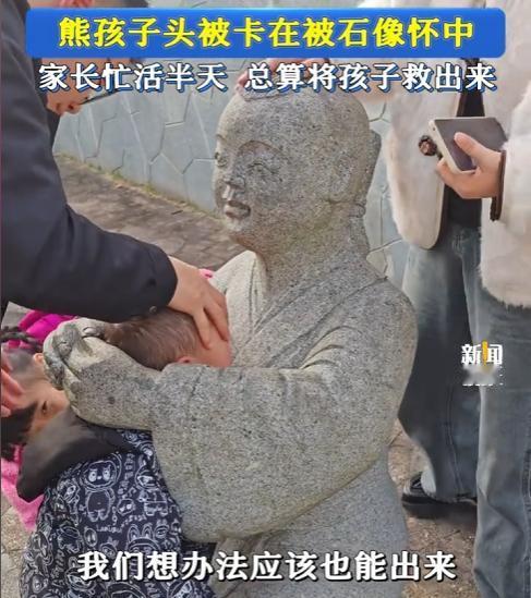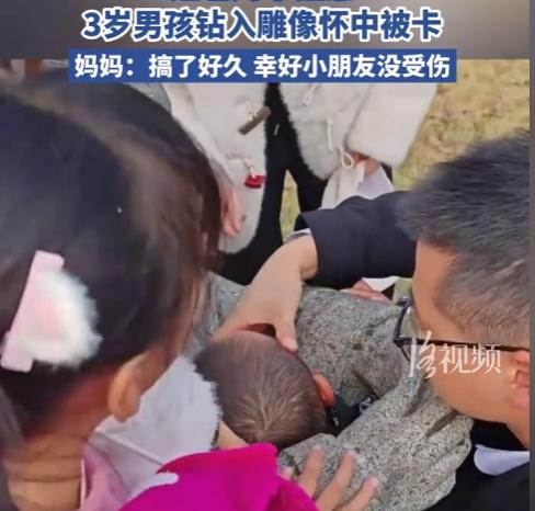 萌娃闯祸名场面!街头石像秒变 “锁娃神器”,3 岁娃钻进去就出不来,哭喊救命急坏家长,网友笑称石像等到 “天选之子”! 12 月 27 日贵州铜仁,一名 3 岁男孩趁家长没留意,盯上街头石像的怀抱,不知怎么就钻了进去。可刚钻进去,头部就被石像缝隙牢牢卡住,动弹不得。男孩瞬间慌了神,吓得持续哭喊 “救命”,委屈又着急。 被困小孩妈妈田女士事后采访说:“也不知道他咋进去的,想着他能进去,我们想办法应该也能出来,开始还以为很容易就弄出来了,在那搞了好久,但还好小朋友没受伤。” 田女士和家人小心翼翼调整孩子姿势,不敢硬拽,折腾了许久,终于将男孩安全救出,万幸孩子没受伤。 此事传开后,网友们被逗得不行,纷纷调侃 “石像蹲守多日,终获天选之子”“萌娃用实力证明,进去容易出来难”。玩笑归玩笑,街头石像、栏杆缝隙这些看似无害的地方,都是藏在娃身边的 “隐形陷阱”。 家长一时疏忽,就可能让娃陷入惊魂时刻,还好有惊无险。