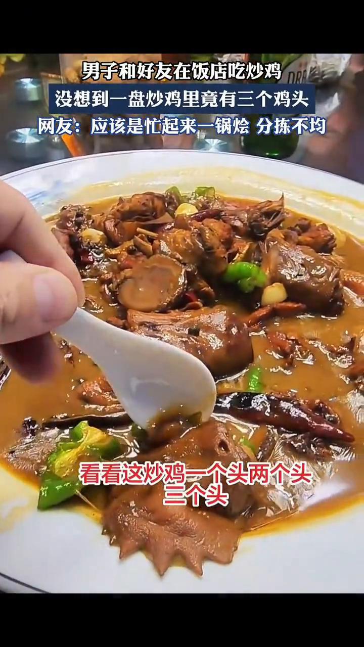 男子和好友在饭店吃炒鸡,没想到一盘炒鸡里竟有三个鸡头。 网友:应该是忙起来一锅烩分拣不均。 看看这炒鸡,一个头、两个头、三个头,还能找着第四个来吧。第四个就差不多了。