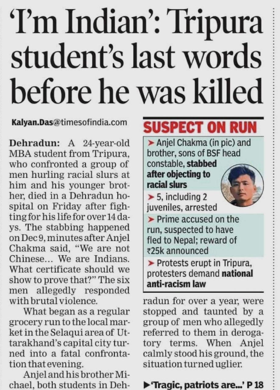 印度北阿坎德邦,24 岁 MBA 学生安吉尔·查克马和弟弟在市场购物时被一群印度人认为是中国人并拦住他们最终被刺身亡近日,尽管查克马一再解释“我是印度人,不是中国人”,但仍未能阻止暴行,最终被刺身亡。 该邦与中国西藏和尼泊尔接壤,当地原住民属蒙古人种。因外貌接近东亚人,印度东北部少数民族长期遭受系统性歧视。 这事真是荒唐到极点!一个印度人,在自己国家的土地上,居然因为长得“太像中国人”就被自己的同胞活活打死,怎么解释都没用。这哪是什么误认,根本就是印度社会里种族歧视大爆发!自己人对自己人都能下这种狠手,印度某些人的脑回路,真是让人无法理解。