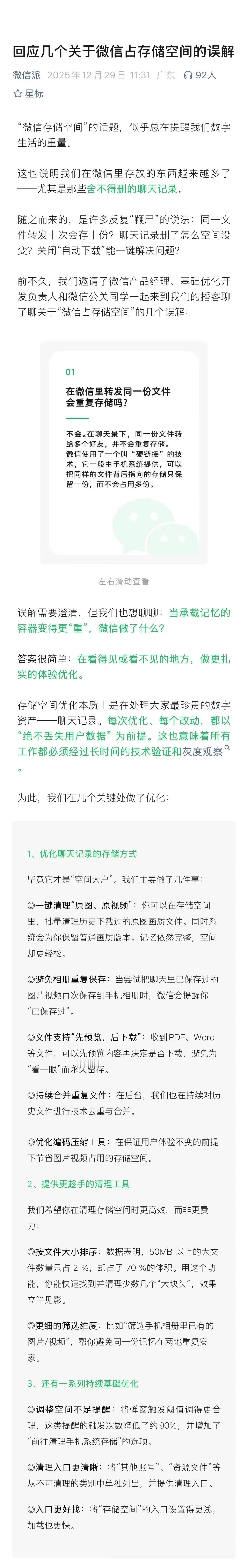 微信一键清理能释放10多个G 12月29日,微信团队集中回应了关于存储空间占用的8个常见误解,明确转发同一文件不会重复存储、过期文件及删除的聊天记录不再占用空间,还解释了安装包11年膨胀500倍、弹窗提醒空间不足等用户关心的问题。 微信文件先预览后下载能省空间 官方指出,微信占用空间超40GB的重度用户,聊天记录平均占比高达70%。针对存储焦虑,微信已上线多项优化功能:一键清理原图原视频(保留普通画质)、避免相册重复保存、文件先预览后下载,后台还会自动合并重复文件、优化编码压缩。按文件大小排序清理,能快速释放大量空间,有用户已靠一键清理释放10多个G。(来源:财经网科技)