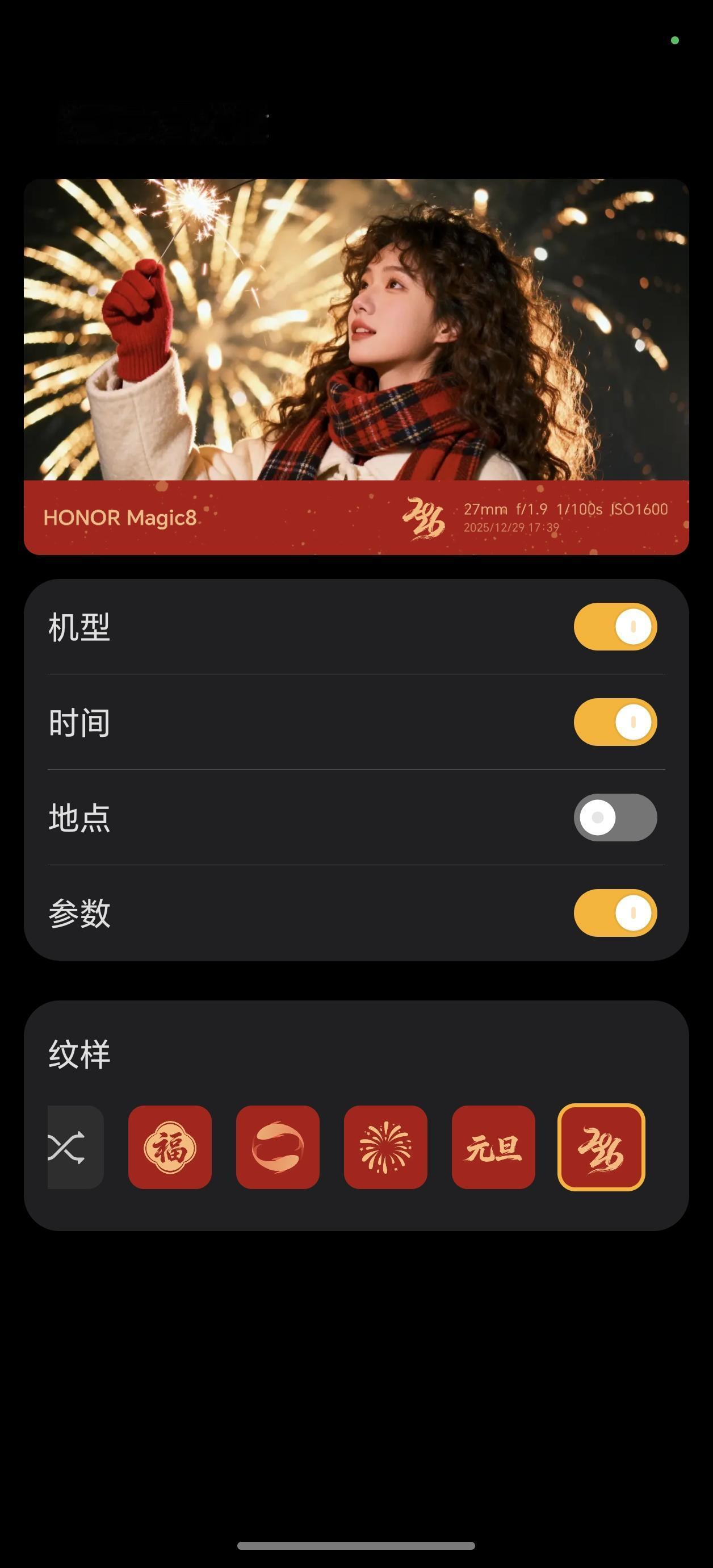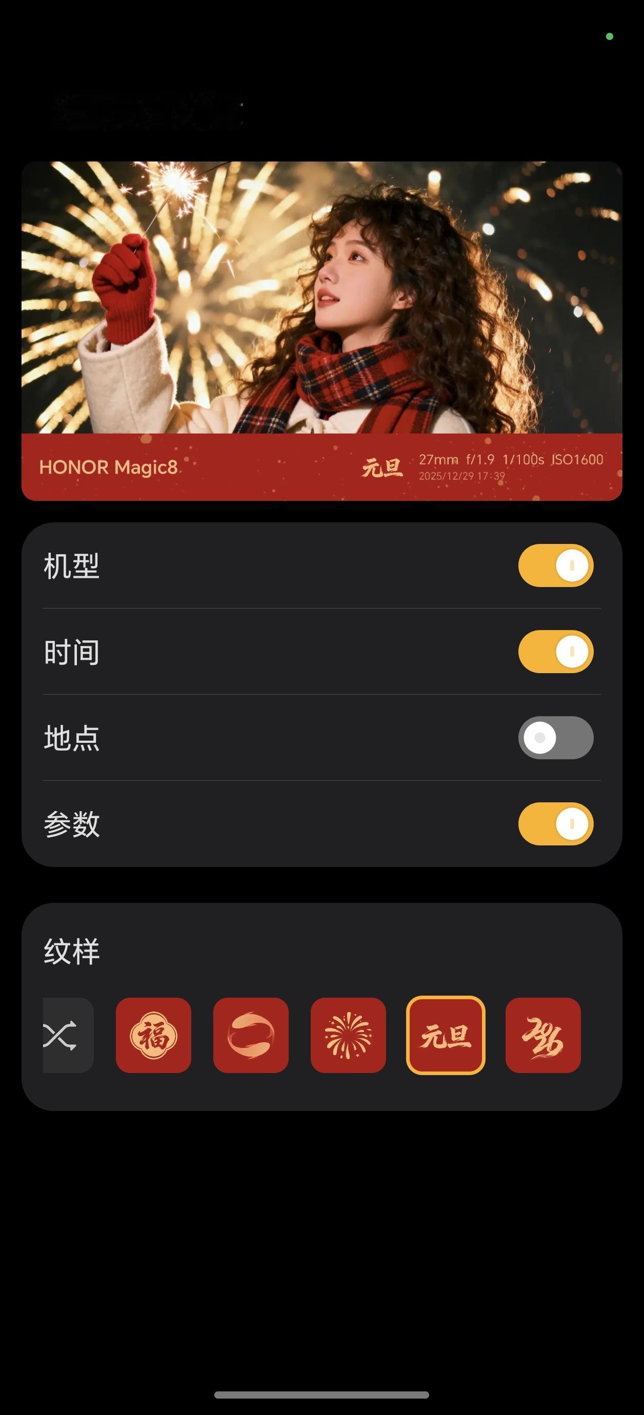 荣耀手机用户们,我刚发现:相机里的“水印”功能限时推送了两款元旦新春主题水印!两款纹样可随心挑选,寓意新的一年红红火火、万事顺心。