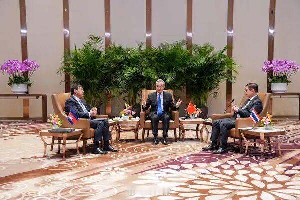 中柬泰外长在云南玉溪举行三方会晤,三方还挽手臂合影。看来在中国调停下谈得不错,希望两国早日恢复和平。中柬泰三国外长挽手臂合影