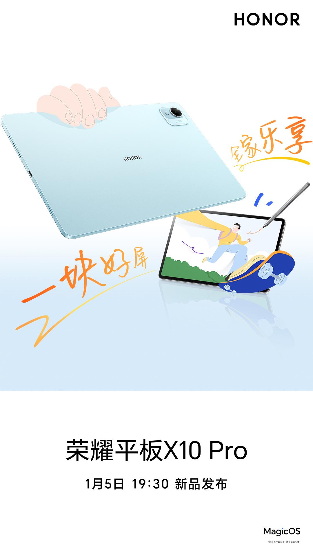 荣耀平板 X10 Pro 也在 1 月 5 日发布,11.5 英寸 2.5K LCD 护眼柔光屏,8+128GB 和 8+256GB 两个版本,苍山灰、晴空蓝两款配色,LCD 永不为奴系列。