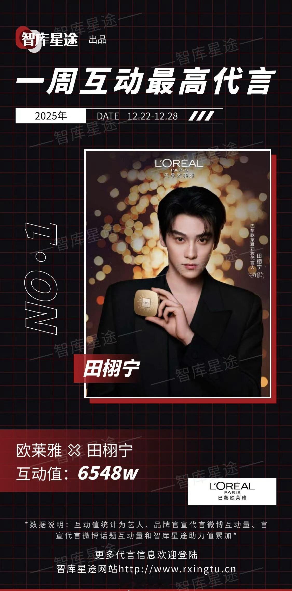 上周互动值最高的代言是田栩宁巴黎欧莱雅,互动值6548w,恭喜代言人田栩宁,田栩