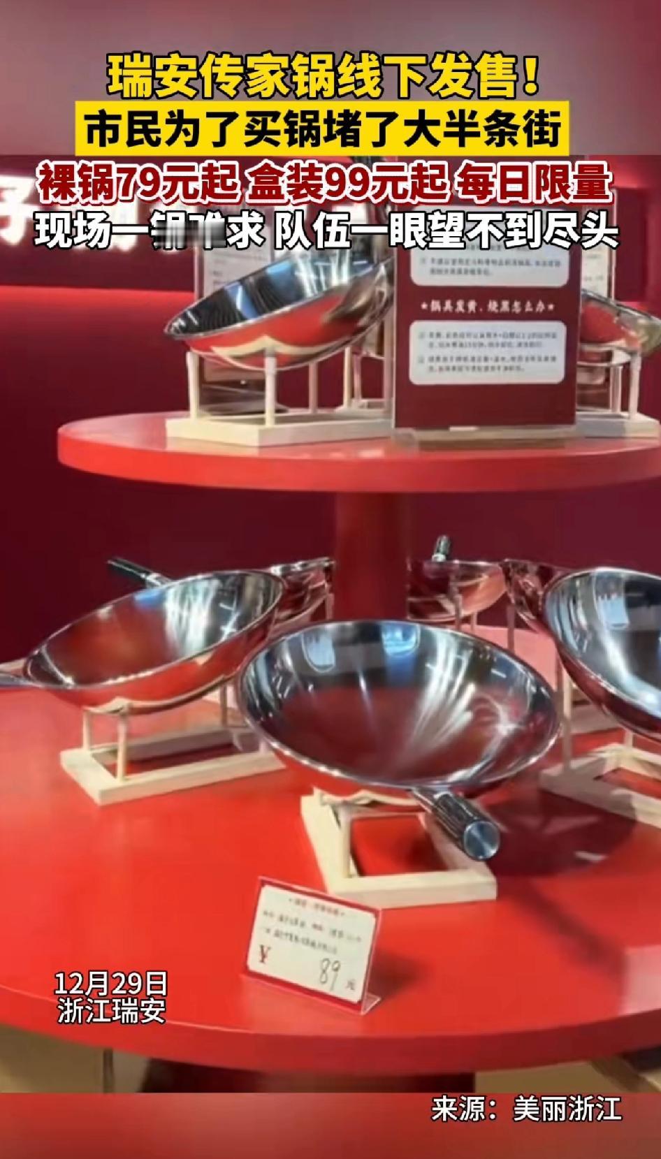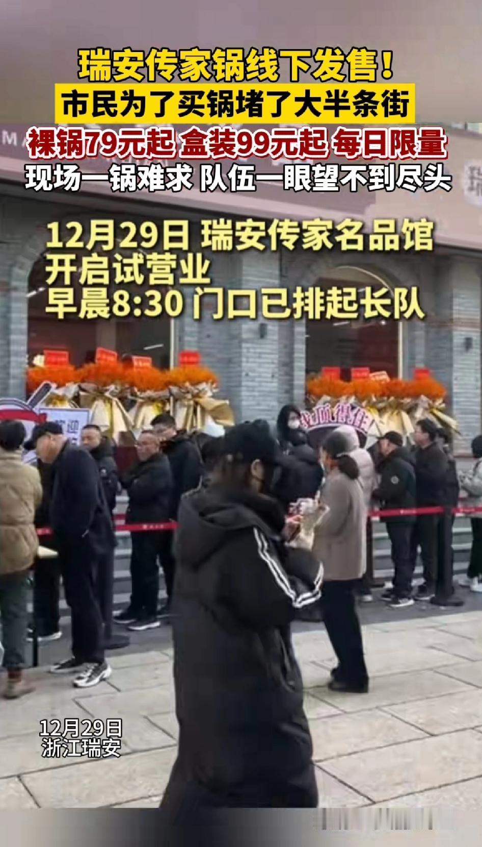 瑞安传家锅线下发售!市民为了买锅排队堵了大半条街。裸祸79元一个,带包装99元一个,这差价 20 元,就看大家是更看重实惠还是包装了。现场一锅难求,排队买过的队伍一眼望不到头。 中国人就是爱凑热闹,一个炒菜的锅,买一个放在家里能用很多年。买个锅都要排队,厂家不但靠着一条视频起死回生,现在又在搞饥饿营销,一个炒菜锅定价在79-99元,在我看来价格不高也不低,人人都能消费。 只是不知道这个锅用起来到底怎么样,如果真是很好用,或者不容易生锈,等我搬家时也要买上一口。 一大早就去排队买锅,看来群众也是好奇这锅到底有啥特别之处,能让这么多人趋之若鹜。 说不定质量超棒,或者是有独特的设计。但这排队的场景也有点吓人,感觉为了一口锅这么折腾,不知道最后拿到手会不会觉得值呢。 现在就看老百姓买回去,用了之后的评价了。