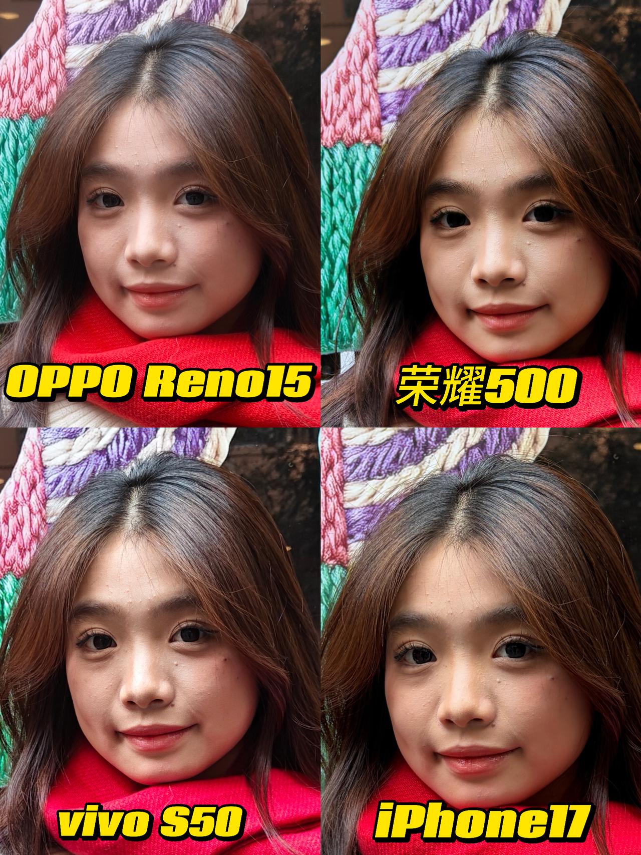 这么一看,苹果和安卓谁拍人更好看? 估计到现在还是有很多人觉得iPhone拍照比较好看,安卓好看更多是美颜、不够自然... 如今我凑齐了iPhone17和几款国产拍照手机,把国产手机的美颜效果开到👄低! 有OPPO Reno15、vivo S50、荣耀500,配置亮点各有差异,那谁拍的更好看? - OPPO Reno15的肤色比较红润,妆感自然,看起来比较舒服,也没有过度的算法痕迹,没有数码味,整体很柔,甚至还有点光学味,看鼻子鼻翼部分更立体更有质感; 荣耀500和vivo S50比较像,对比度和锐化效果十足,整体清晰; iPhone17依旧是真实还原,肤色有点偏黄,相比以前我觉得没有那么锐化了。 - 各花入各眼,每个人喜欢的风格不同,手机成像效果也不同,说iPhone好看的也有,觉得安卓不错的也有,你们觉得哪一手机拍的好看?个人比较喜欢Reno15的风格,相对而言锐化算法痕迹较少。 你们觉得呢? 手机拍照 拍照手机 手机人像 iPhone人像 iPhone17 OPPOReno15 荣耀500