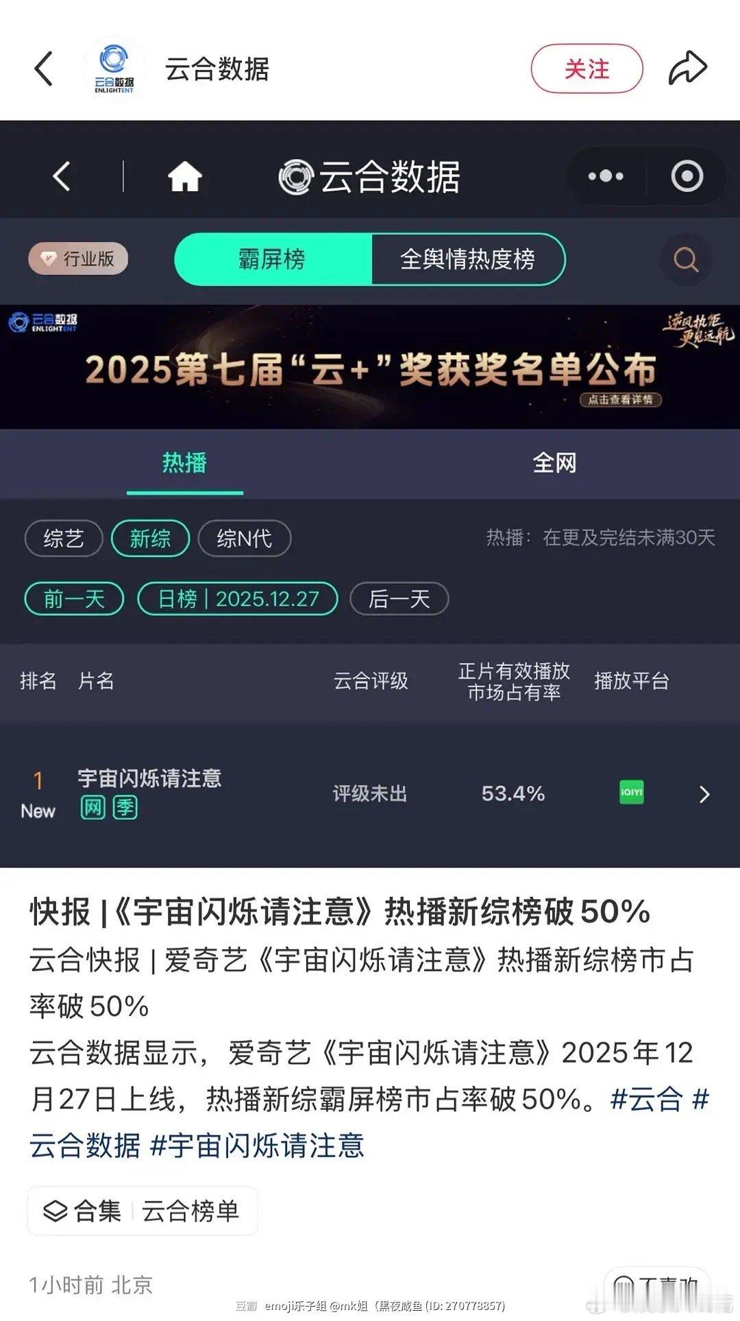 综艺《宇宙闪烁请注意》云合热播新综榜破50%登顶,什么水平?笑点好密集的一部