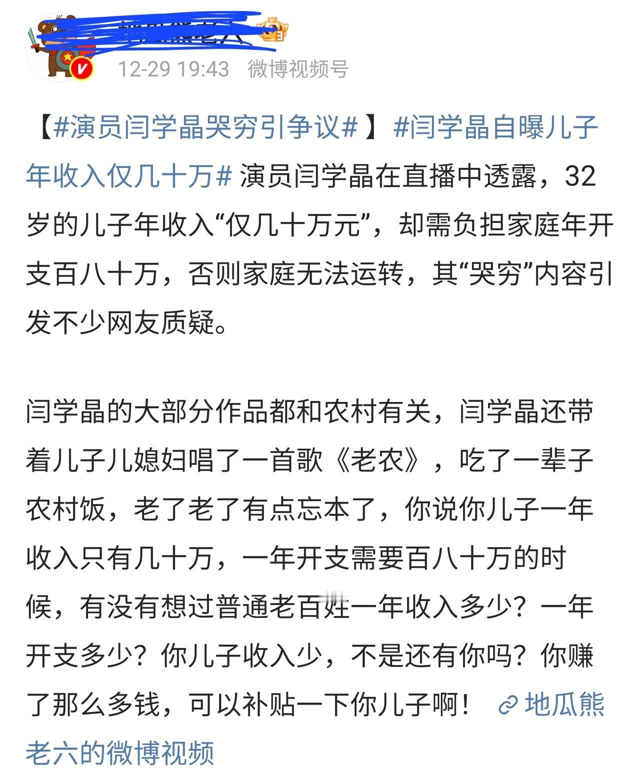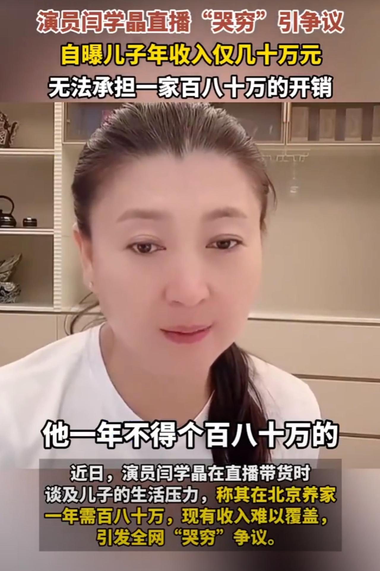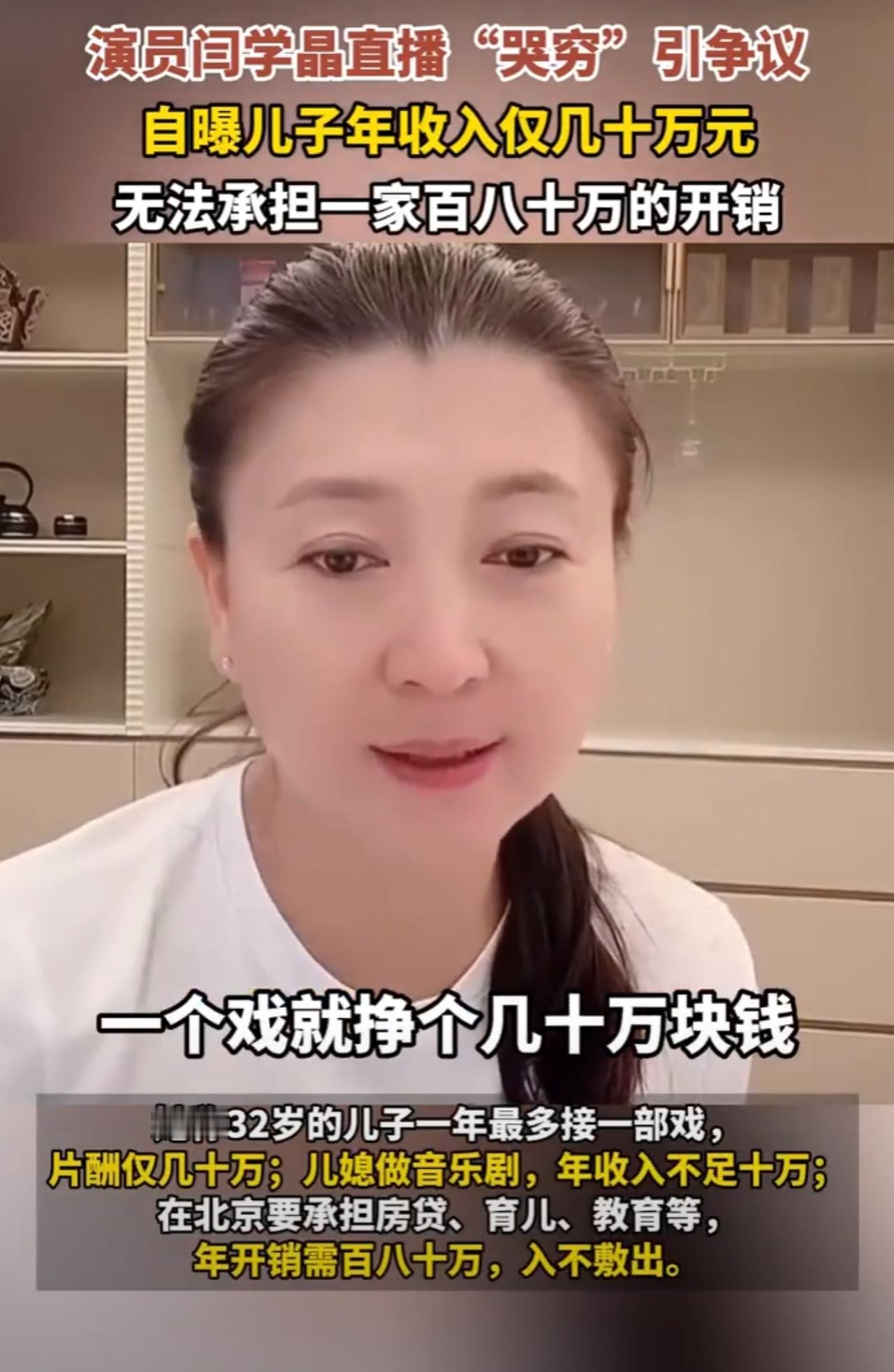 一年赚个几十万,在这些明星眼里居然连日子都过不起,还当着直播间那么多普通老百姓哭穷。 闫学晶这个路也是走窄了。 就像网友说的,这姐姐饰演农村百姓起家。 体验的也是普通老百姓的人生。 结果到头来,说自己儿子开销一年百八十万,只赚个几十万,过不了。 我就想问问我身边一个月挣3000多的,到底是怎么活的?