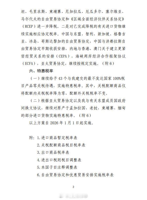 2026年关税调整方案1月1日起施行关于2026年关税调整方案的公告 12月29日,海关总署官方发布《国务院关税税则委员会关于2026年关税调整方案的公告》:为深入贯彻党的二十大和二十届历次全会精神,引领发展新质生产力,不断满足人民对美好生活的需要,助力扩大高水平对外开放,推动高质量发展,根据《中华人民共和国关税法》及相关规定,自2026年1月1日起,对部分商品的进口关税税率和税目进行调整。