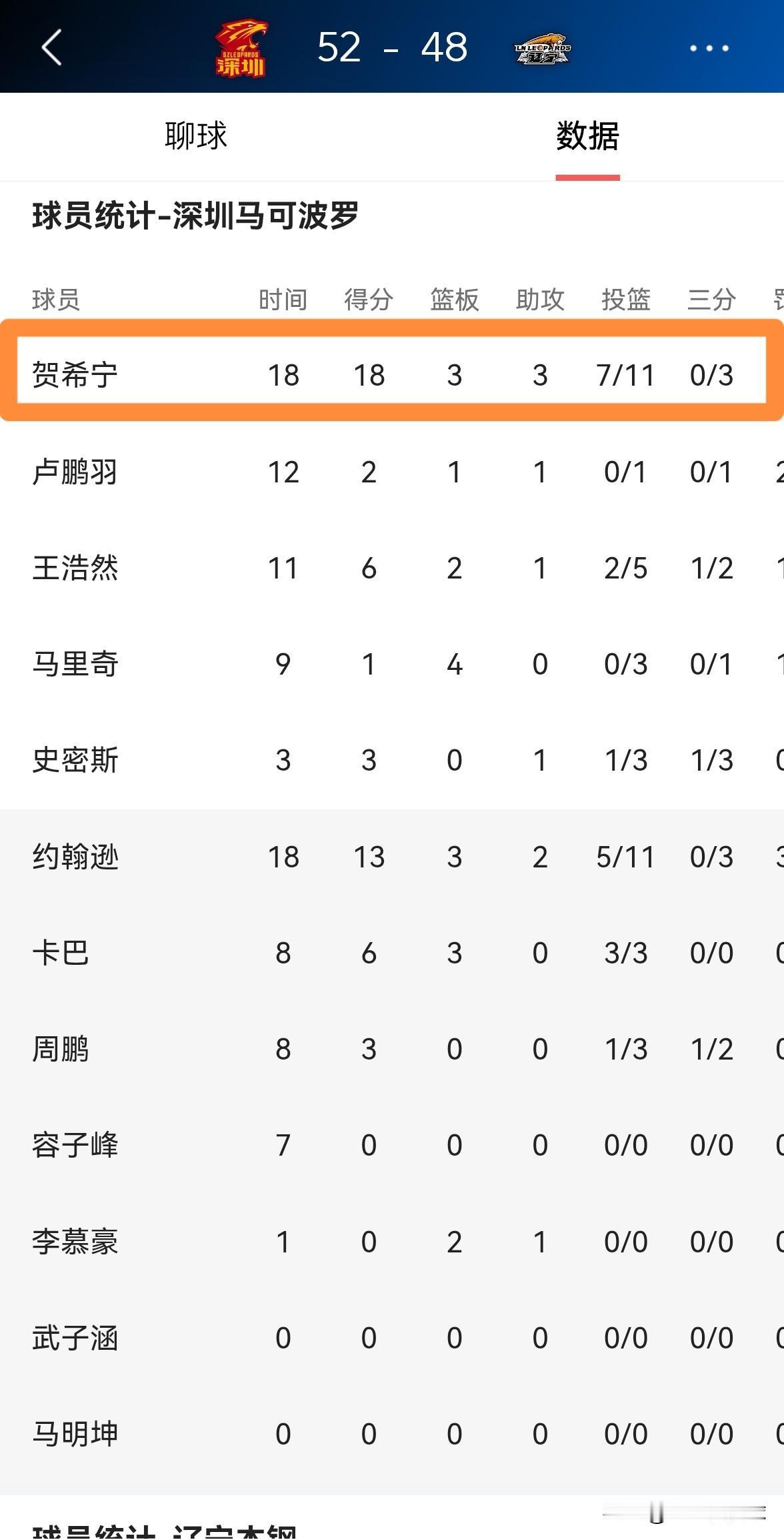 深圳马可波罗球星贺希宁真是大杀四方!在今天深圳马可波罗主场迎战辽宁本钢的比赛中,目前双方半场战罢,深圳马可波罗以52:48领先对手。在前两节比赛中,贺希宁首发出战18分钟,投篮11中7,其中三分球3中0、罚球5中4砍下18分3篮板3助攻1盖帽,他的场上正负值为-+6。 毫不夸张的说,以贺希宁目前的得分能力来看,虽然他不是外援却胜似外援。