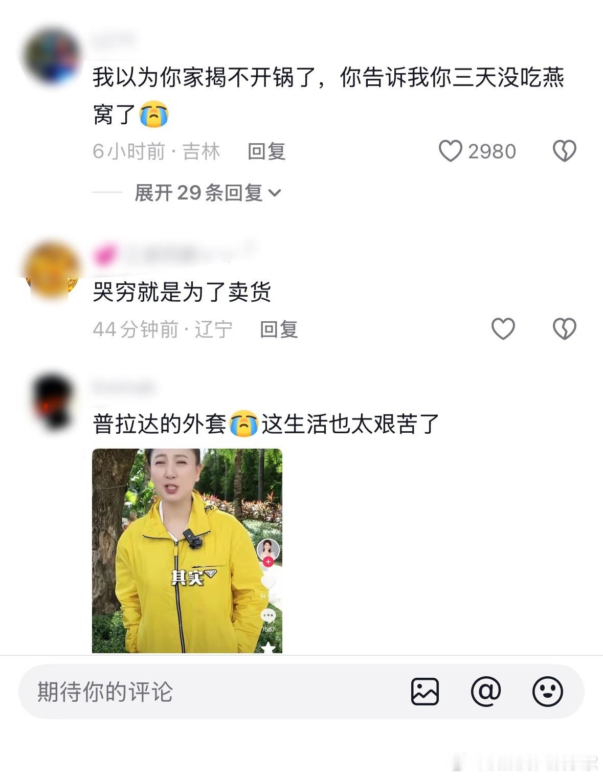 她儿子再穷,拍一部戏也有几十万收入…所以,真觉得明星没必要跟我们分享这些,我们无法理解她的焦虑,她更无法理解我们普通人的焦虑。像王传君还说他最穷的时候卡里只有一百万呢!普通人就是没办法共情明星,一个日均还不到一百块钱的去共情一天几十万甚至上百万的人,还是多心疼心疼自己吧!演员闫学晶哭穷引争议