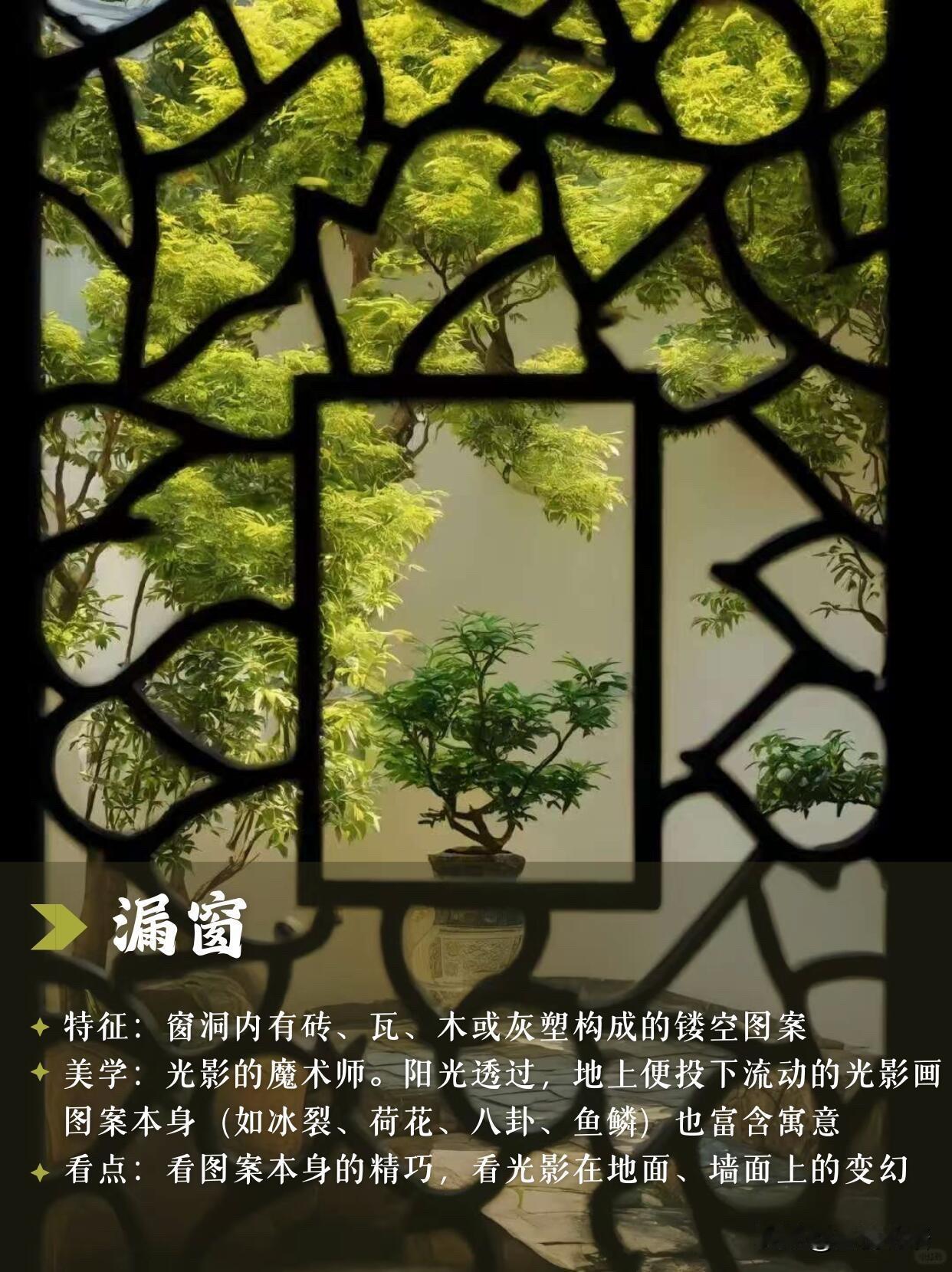 苏州园林的空窗真的是独一无二 造园师是把浪漫刻进骨子里了~ 空窗像个天然画框, 框住亭台流水, 一眼就是一幅立体画。 漏窗更绝, 冰裂、荷花的镂空图案, 让阳光洒下流动的光影, 地上都在写诗。 逛园林千万别急着走, 找个斜光的午后, 凑到窗边看一看。 那些藏在窗后的巧思, 是东方美学独有的温柔。 这种慢下来才能发现的美, 真的治愈又上头~ 苏州园林
