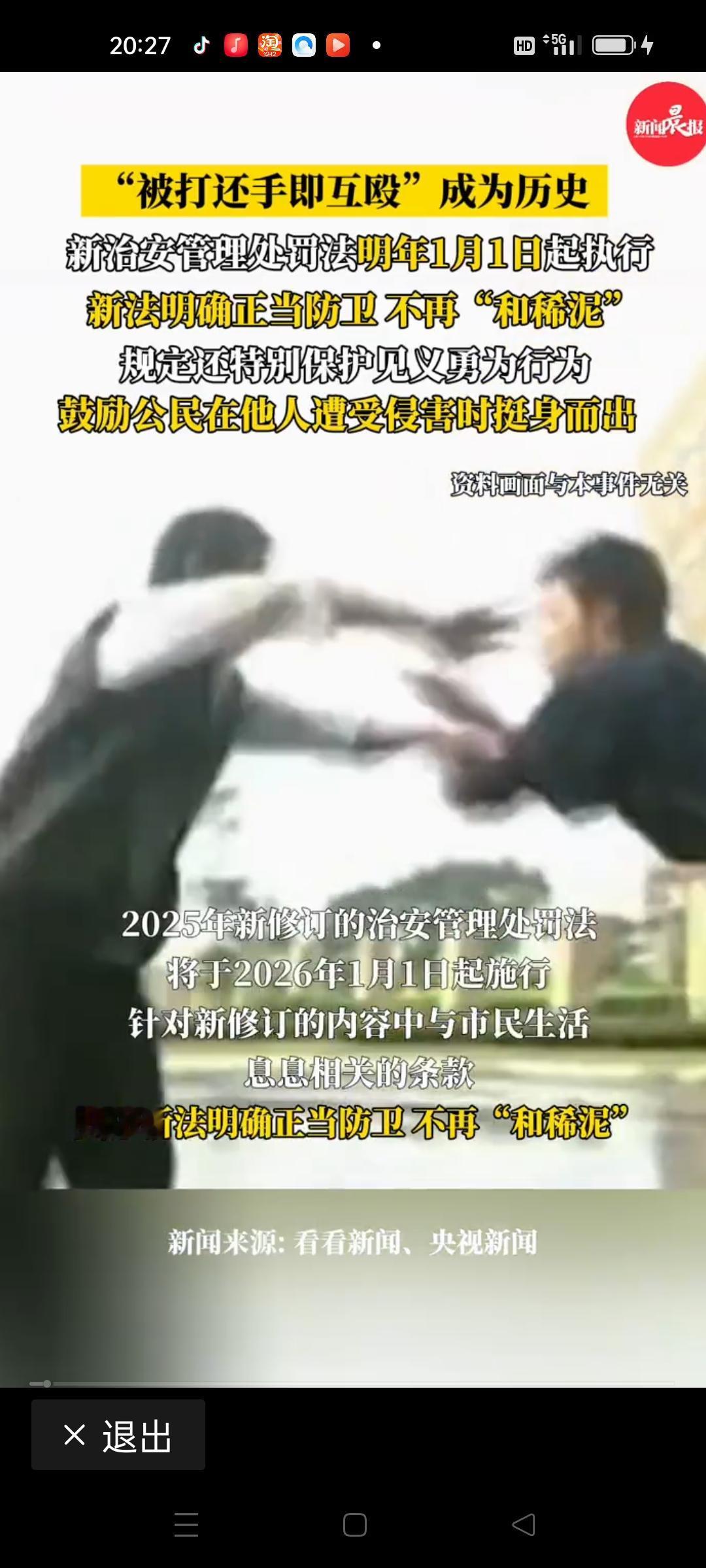 还手不等于互殴,新法明确正当防卫 在很多人的认知里,一旦被人攻击,反击就是“打架”,是“互殴”。但事实真的是这样吗?最近,关于正当防卫的新法律条文终于明确了这个问题的底线,让我们看到了法律对“合理反击”的全新定义,也让无数普通人心头一震。 曾几何时,许多人在面对突如其来的攻击时,出于害怕、愤怒甚至无奈,选择反击。但反击的界限在哪里?什么时候会变成“打架”或“故意伤害”?过去的法律模糊不清,让很多人在被攻击时心存顾虑:我反击会不会变成犯罪?我是不是“越界”了?这些疑问让不少人在危急时刻选择了忍让,却也因此错失了保护自己和家人的最佳时机。 如今,新法明确了“正当防卫”的边界。只要你是在“防止正在进行的不法侵害”,反击的行为就不再是“打架”或“故意伤害”。这意味着,面对攻击时的合理反应,是法律所保护的。换句话说,只要你在保护自己、家人或公共安全的范围内进行反击,就算“还手”,也不算“互殴”。 这项新规定的背后,折射出的是对人性善良本能的尊重和对社会安全的保护。它告诉我们:面对危险,不要一味忍让,更不要因为害怕“越界”而束手就擒。只要你是在合理范围内反击,法律会站在你这一边。它鼓励我们在面对不法侵害时,敢于“还手”,而不是被动忍受。 更令人欣慰的是,这也引发了公众对“正当防卫”认知的广泛讨论。有人说:“终于明白了,反击不是打架,而是自我保护。”有人感慨:“法律的底线变得更清晰,普通人也能更有底气地保护自己。”当然,也有人担忧:“会不会有人利用新法,反而变成‘故意挑衅’?”这都值得我们深思。 其实,法律的每一次调整,都是对人性善意的呵护。它让我们明白:在面对不公和危险时,勇敢反击是正当的,是应得的权益。而这,也许正是我们每个人都期待已久的社会正能量——用法律的力量守护我们的安全,用理性的态度面对每一次可能的冲突。 你怎么看?面对“还手不等于互殴”的新法,你是否觉得更加安心?或者你有更深的疑问和想法?欢迎在评论区留言,让我们一起讨论这个关系到每个人切身利益的话题!正当防卫 正当防卫指南