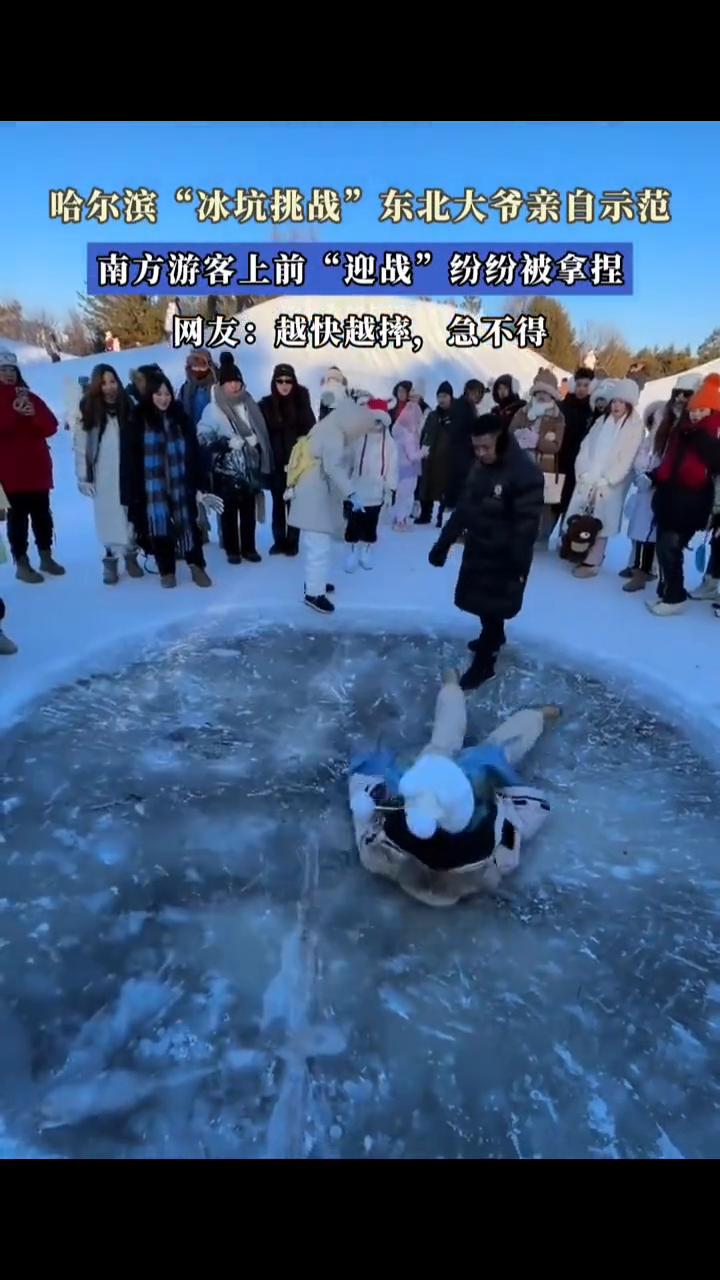 哈尔滨"冰坑挑战"东北大爷亲自示范,南方游客上前"迎战"纷纷被拿捏。 网友:越快