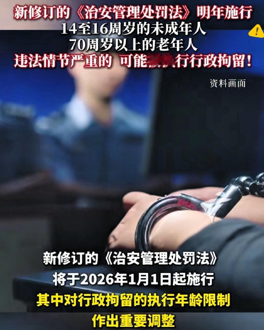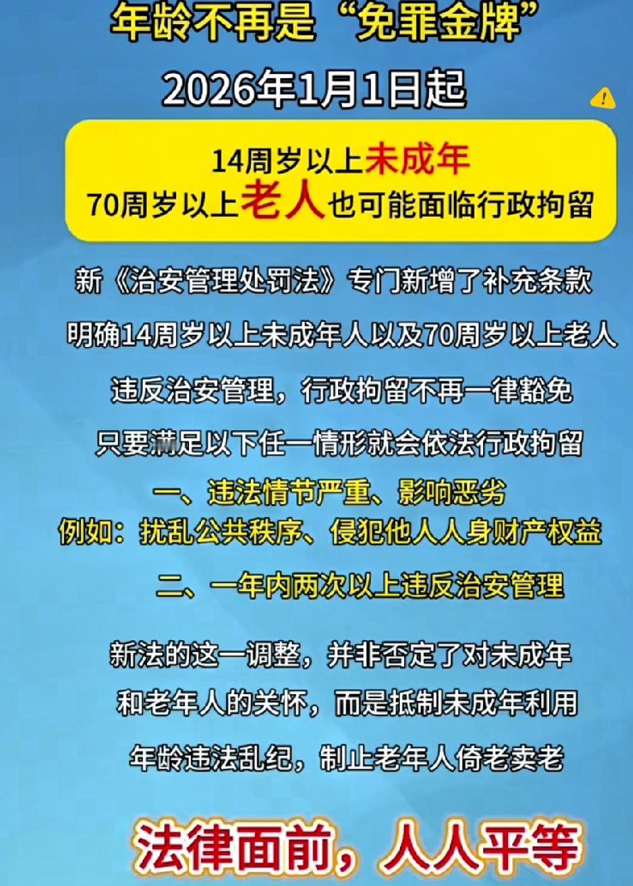 明年1月1日起,“年龄特权”真的要失效了! 14周岁以上未成年人、70周岁以上老年人违法,也可能被行政拘留,这波新规才算真正守住了公平底线! 以前总有人拿“年纪小”“年纪大”当挡箭牌,轻则撒泼闹事,重则违法乱纪,却能免于拘留,着实让受害者寒心。 新法不是一刀切的苛责,而是对情节严重、屡教不改的情况亮剑——初次轻微违法仍有宽容,但谁也不能再凭年龄肆意挑战规则。 法律的本质是保护守法者,不是纵容违法者。 这修订不是收紧关爱,而是让“责任”不分年龄,让公平正义不打折扣。 你觉得这新规能有效遏制“倚老卖老”“未成年作恶”吗? 身边有没有遇到过这类仗着年龄违法的事?