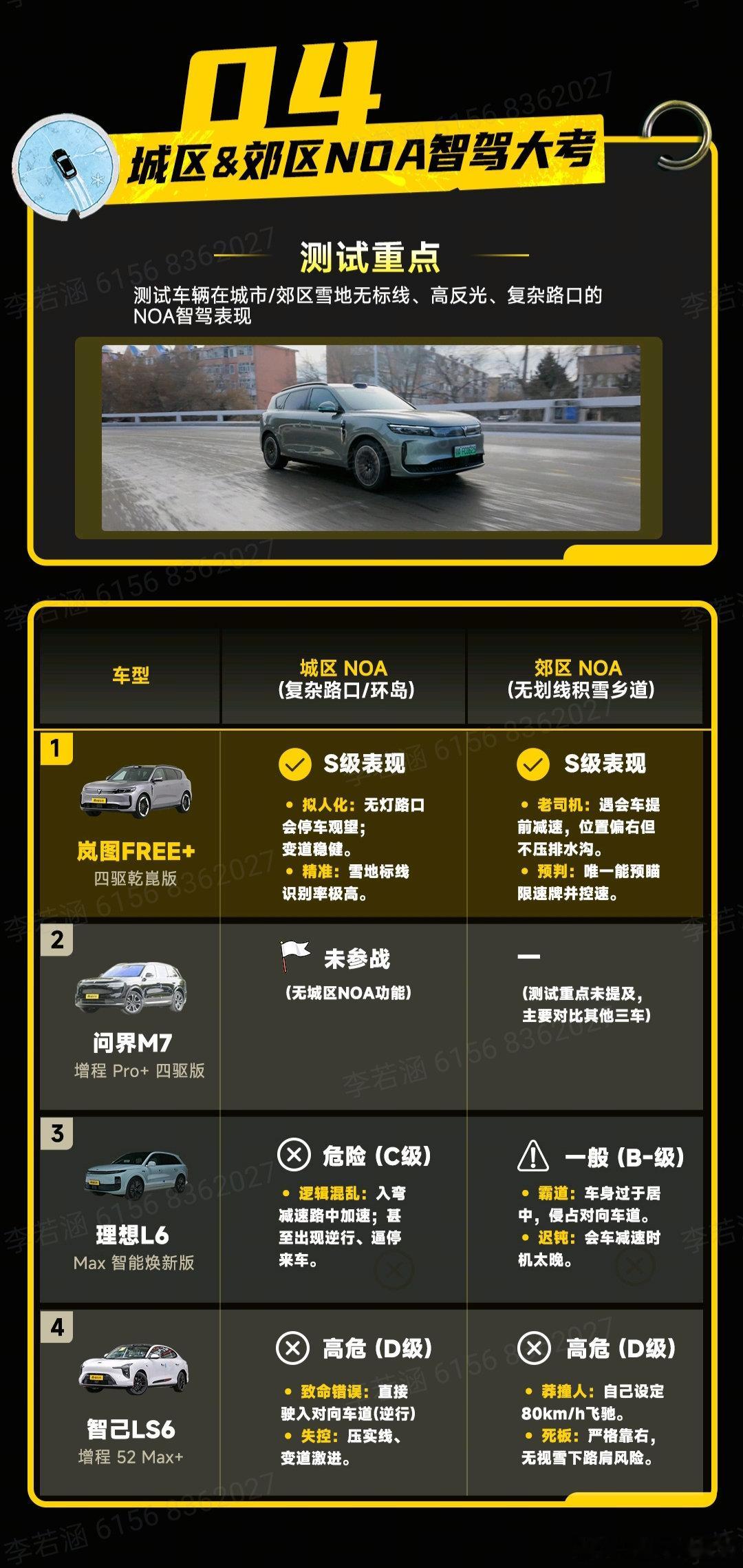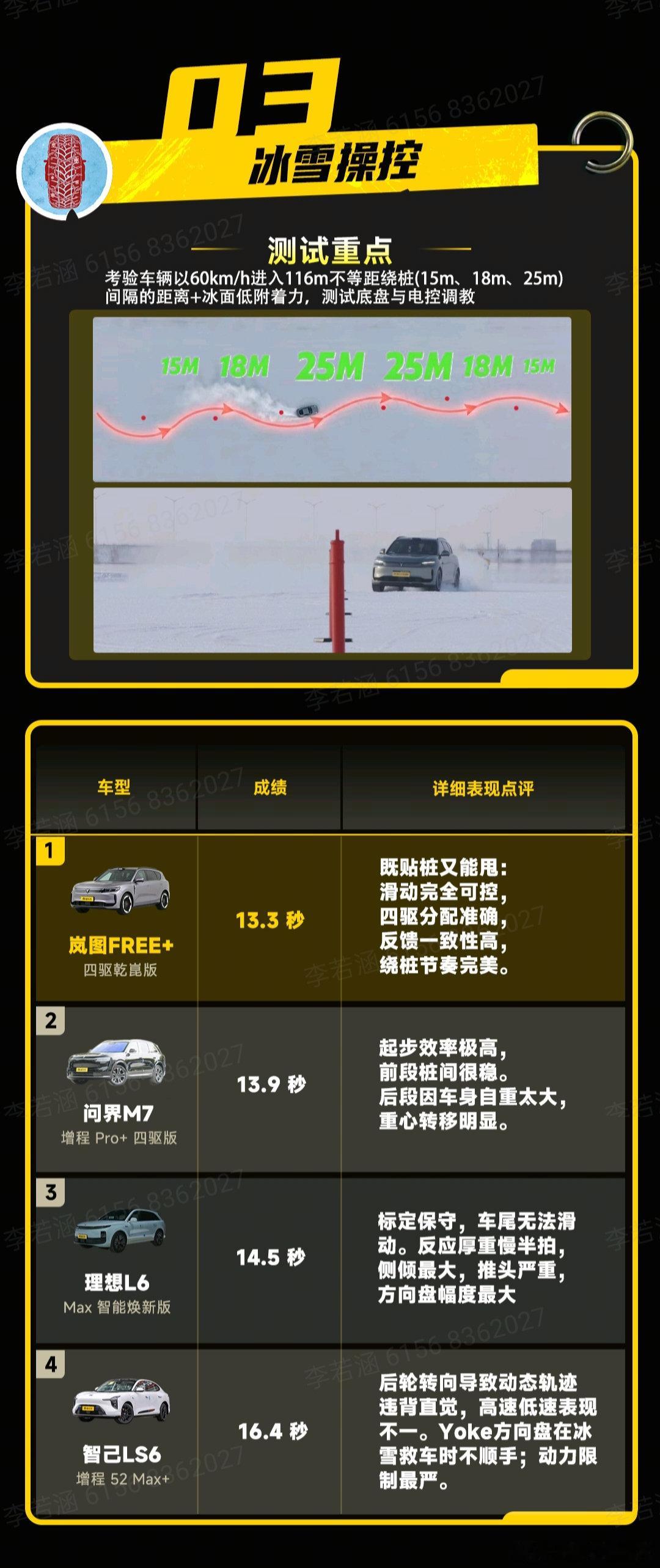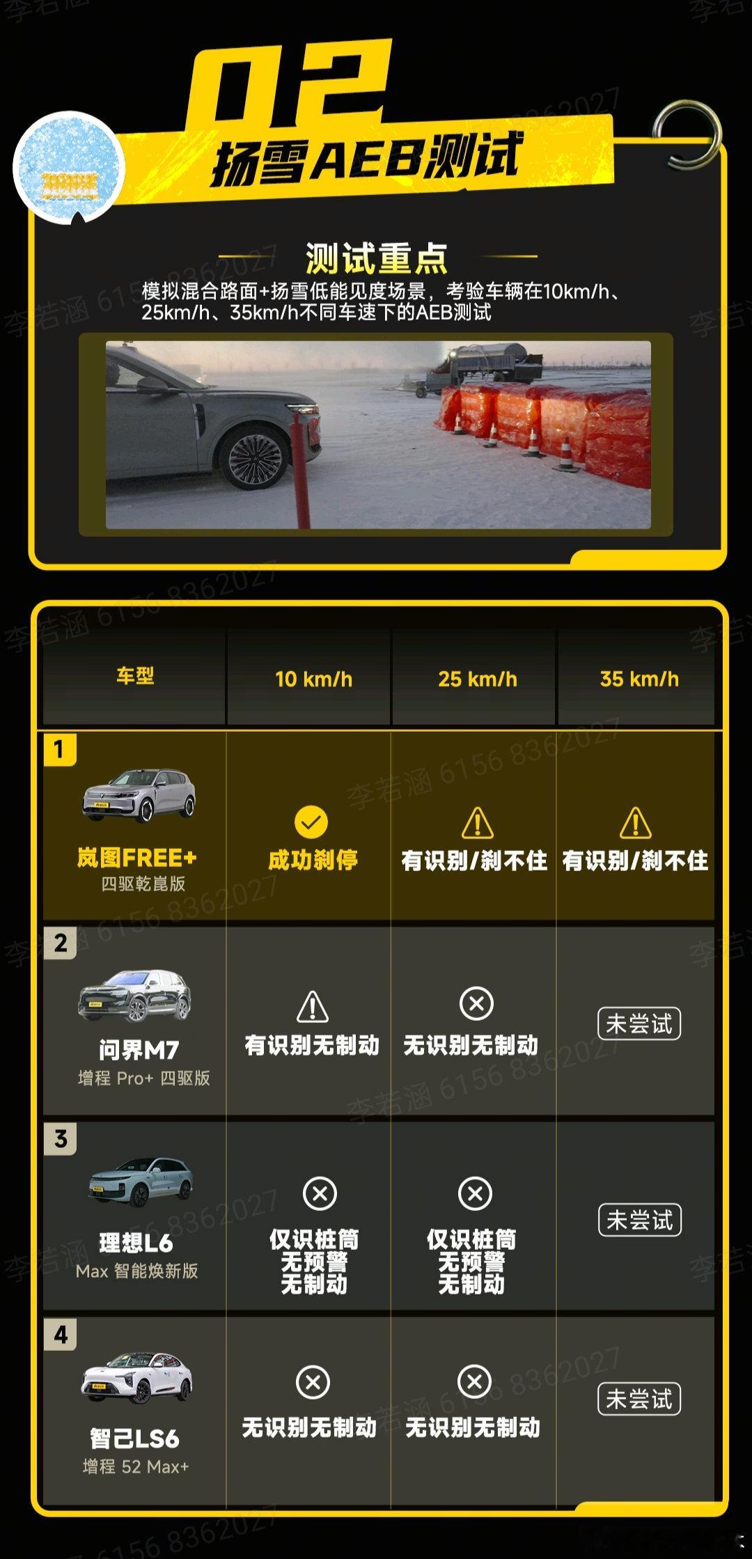 SUV冰雪智驾大比拼:谁在关键时刻掉链子?海拉尔冰雪试炼场一轮实测下来,四款热门车型的表现高下立见:混合路面AEB(35/45km/h):岚图FREE+两速度段均通过;问界M7只报警无刹停;理想L6和智己LS6未识别障碍物,直接失败。冰雪绕桩操控:岚图FREE+跑出13.7秒的最优成绩,转向准、车身好控;智己LS6以16.4秒垫底,转向与动力不给力;理想L6车尾多次失控,横滑明显。城乡NOA:岚图FREE+在城市与乡村场景都拿到S级,复杂路况适配度最高;理想L6评为危险级,智己LS6高危级;问界M7未配该功能,未参测。自动泊车:岚图FREE+、问界M7均顺利泊车;智己LS6能识别车位但泊车过程越界;理想L6无法识别车位,测试未完成。结论很直接:冰雪是真刀真枪的场景,辅助驾驶要么稳到底,要么在要命的瞬间掉链子。25万级SUV 岚图FREE+ 冰雪实测 北方买车必看 AEB测试
