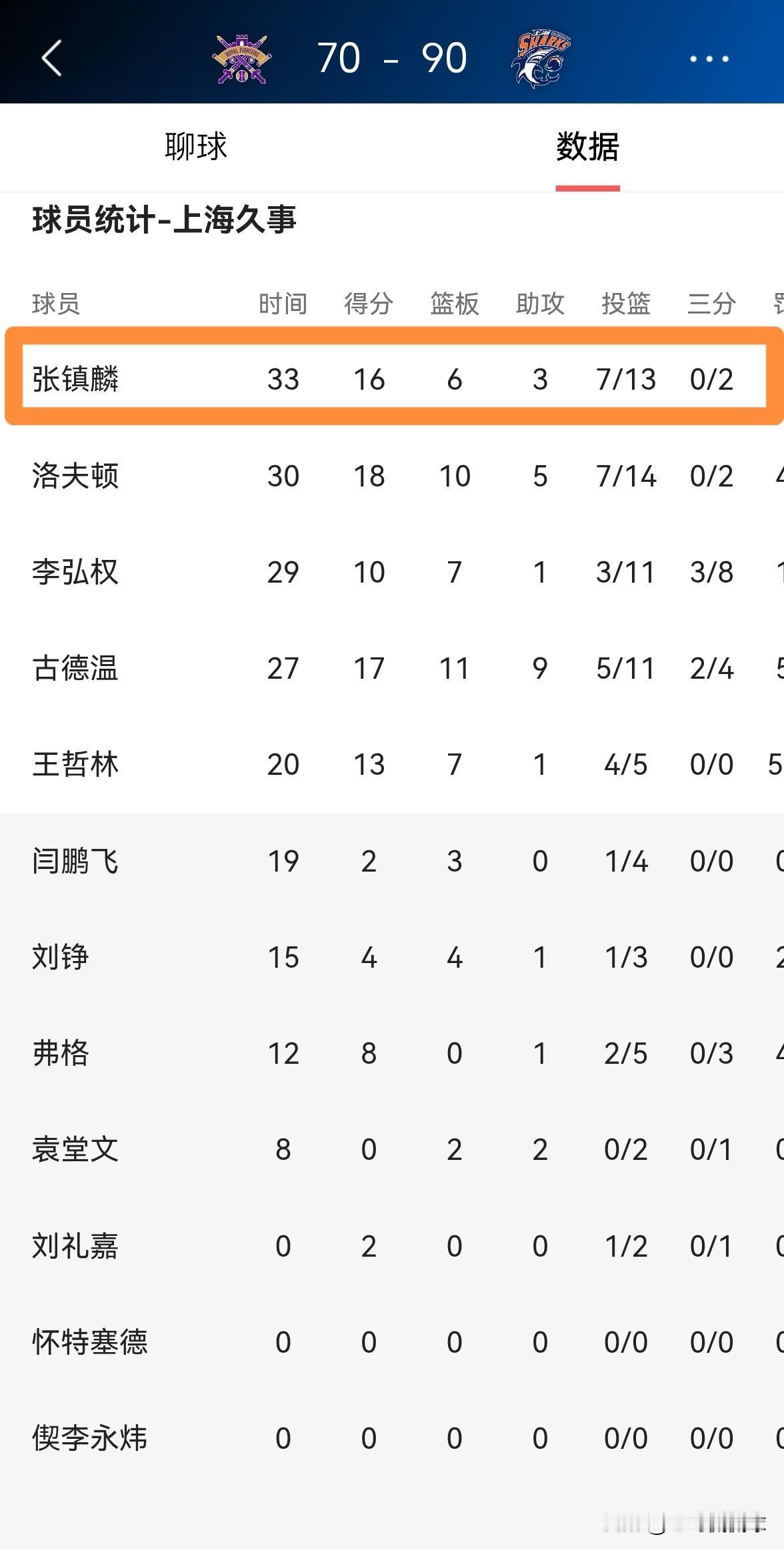 我一定要大赞上海久事大将张镇麟!在今天上海久事客场以90:70大胜北京控股的比赛中,张镇麟在攻防两端都为球队提供了非常大的帮助。全场比赛下来,张镇麟首发出战33分钟,投篮13中7,其中三分球2中0、罚球3中2得到16分6篮板3助攻3抢断,他的场上正负值为+23。 老实说,今天的张镇麟绝对能够让上海久事的球迷感到非常满意,因为张镇麟确实打得非常棒。