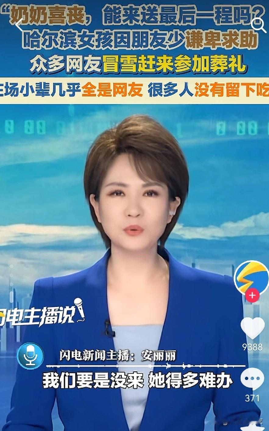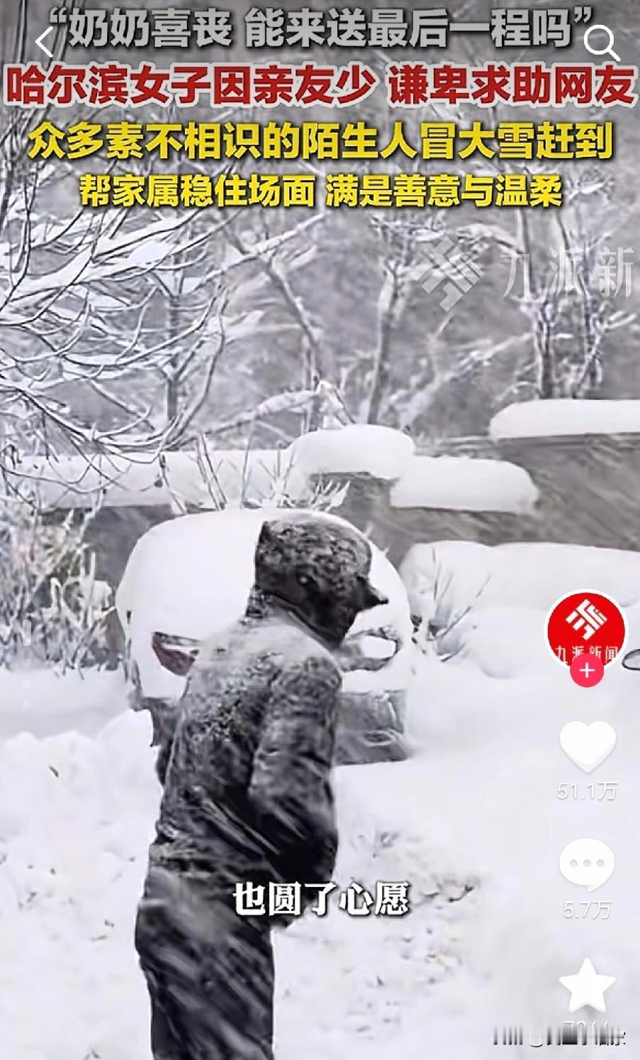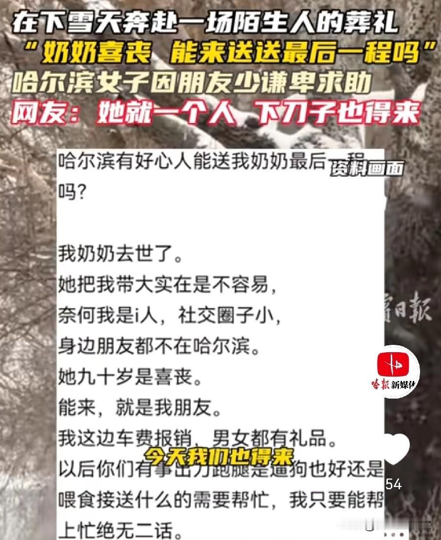 “奶奶喜丧,能来送最后一程吗”,一女子因朋友少求助网友,众人冒大雪赶来,纷纷伸出援助之手,网友说,她就一个人,要是没人去,她得多难办啊。 12月的一天,哈尔滨一女子在社交平台发了一封求助信,内容是因为社恐,没什么朋友,奶奶90岁的喜丧,没有亲朋好友在这边,不想奶奶走的太孤独,请求好心人来帮忙送送,一时间引发了上千人的关注。 评论区里,大家的回复又暖又干脆:“算我一个!”“地址发过来,下雪也挡不住!”“她就一个人,就算下刀子也得来啊!” 12月23日那天,约定的送行日子到了。天空飘着鹅毛大雪,可二三十名素不相识的网友,真的如约赶到了现场。有人专门调整了旅行计划,一对情侣放弃了早就定好的行程,专程赶来;还有一位大哥,连着加了好几天班,拖着疲惫的身子,顶着漫天风雪也匆匆赴约。 没有华丽的辞藻,没有刻意的煽情,这群陌生人,带着一束花、一句送别,默默地站在那里,陪着女子送了奶奶最后一程。那天的风很冷,雪也很大,但奶奶走得一点儿也不孤单。 一场素昧平生的奔赴,一次大雪中的送别,让冰冷的冬日多了一份滚烫的暖意。这世间的善意,从来都不会缺席。 最后想问问大家:你有没有被陌生人的善意温暖过的经历?