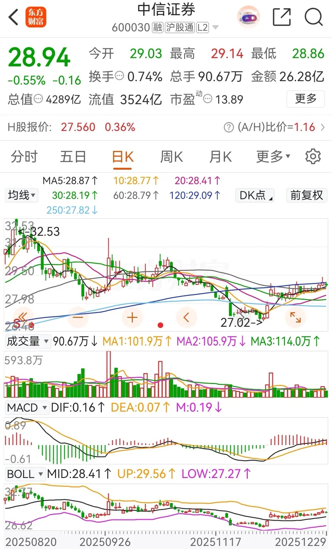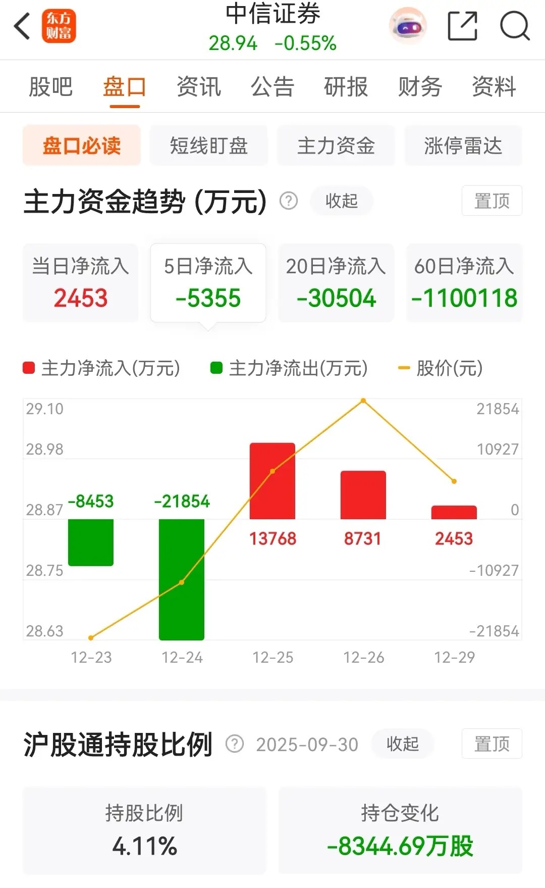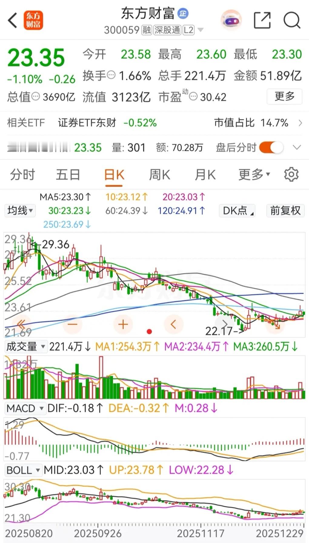 东方财富今天低开低走,被主力资金大幅净卖出了6.35亿元,而中信证券则是冲高回落,收出了一根缩量十字星,且连续三天被主力资金净买入。东方财富今天的整体走势是,早盘低开后震荡走低,几乎就是以最低价收盘,全天的跌幅为1.10%,收盘报价为23.35元。在资金流向上,今天被主力资金大幅净卖出了6.3500亿元,而近五个交易日则是被主力资金合计净卖出了1.9250亿元。从走势上看,日线级别走势在连续上涨三天后,今天缩量回调,整体走势还是比较健康的。中信证券今天的走势与东方财富有些不一样,早盘低开后冲高回落,尾盘时小幅勾起,最终收出一根缩量小阳星,走势上处于多头排列,明显强于东财。截止收盘时,小幅下跌了 0.55%,收盘报价为28.94元,全天的成交额为26.28亿元。在资金流向上,连续三天被主力资金净买入,今天被主力资金小幅净买入了0.2453亿元,而近五个交易日则是被主力资金合计净卖出了0.5355亿元。至于二者的后续走势和技术分析,可以查看上一篇中关于券商概念板块今天的走势分析。