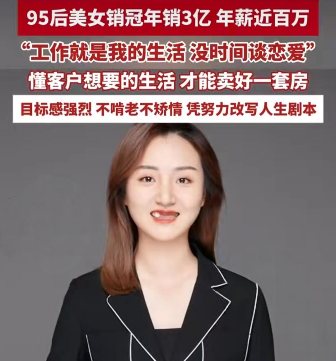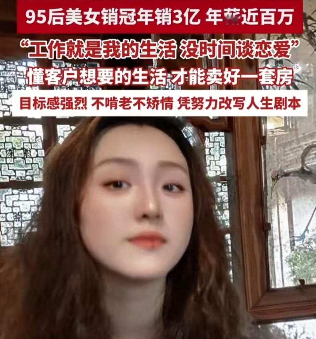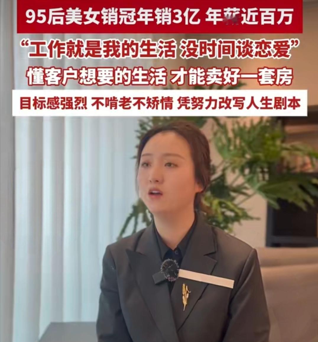 95后姑娘年销3亿拿百万年薪,直言恋爱不是必需品。真是太拼了,你还敢说房子难卖销售难做? 现在大家都说房子卖不动了、销售难做。可青岛这位95后置业顾问刘欣,硬是杀出一条血路,一年卖了56套房,总销售额超3亿,年薪直奔百万! 别人抱怨市场冷,她却摸透客户心思,知道大家想要的不只是房子,更是理想的生活。她不矫情不啃老,把工作当成全部生活,忙到连谈恋爱的时间都没有,直言恋爱压根不是必需品。 她曾坦言自己天生适合做销售,懂客户想要的生活才能卖好房,还说自己目标感强,不啃老不矫情,就想凭努力改写人生。 更让人佩服的是,刘欣直接说“工作就是我的生活,没时间谈恋爱”,在她眼里恋爱根本不是必需品。为了工作连恋爱的时间都挤不出来,这拼劲难怪能做出这么亮眼的成绩,活该她赚大钱! 你看同样是做销售,有人躺平叹气,有人拼命搞钱。这差距,真的太扎心了!看房现状 销售冠军 销售 销冠 房子 房地产 房地产市场 房产