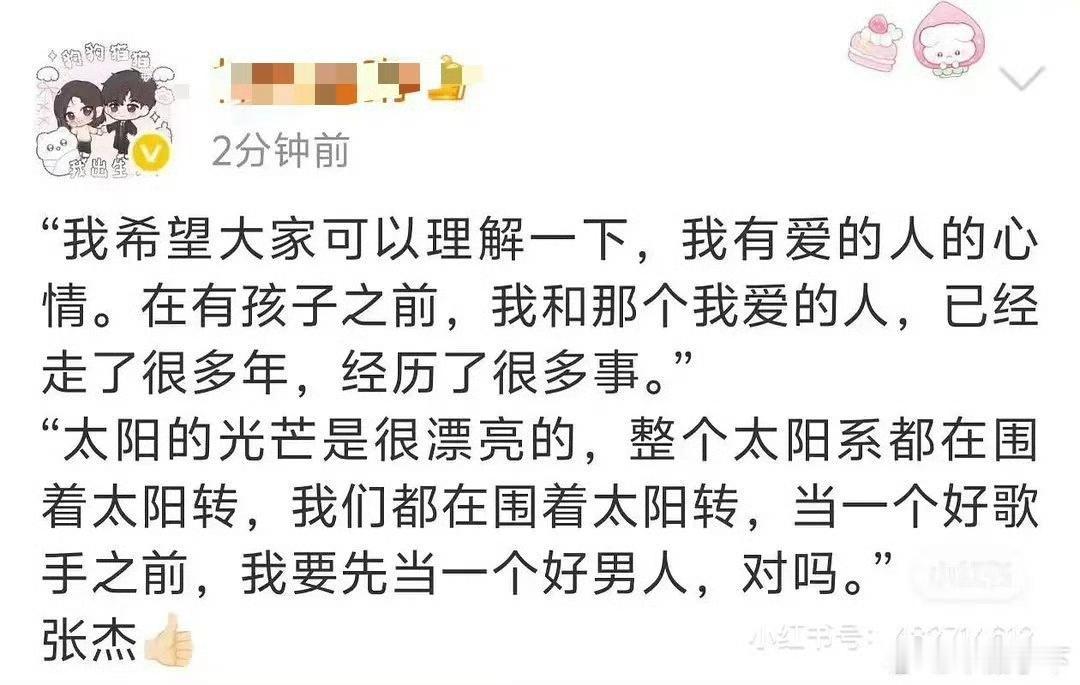 张杰说:“当一个好歌手之前,我要先当一个好男人” 张杰的爱一直拿得出手,他在澳门跨年演唱会上公开维护妻子谢娜,:我希望大家可以理解一下,我有爱的人的心情。在有孩子之前,我和那个我爱的人,已经走了很多年,经历了很多事。当一个好歌手之前,我要先当一个好男人,对吗? 只因为部分粉丝指出工作室未提前公布谢娜担任双人舞嘉宾,导致购票者无法预判演出内容,认为侵害选择权。唯粉张杰的个人演唱会,粉丝冲着音乐去的,不想看非专业的嘉宾表演很正常。 但是这么多年了,张杰作为一个歌手,不割韭菜、不乱上综艺、就纯粹的做一个歌手,他在我眼里一直都是非常真诚且纯粹的人,演唱会邀请自己的妻子为自己伴舞,这不是很正常吗? 难道要他在演唱会媚粉,叫台下的粉丝老婆们吗?他如果真的这么做了,才是脑子坏掉了, 喜欢他,就要尊重他的家人朋友,哪怕不喜欢,也不要去诋毁谩骂,关于你不喜欢的部分,你可以不去看,不去评。 说话都不要戾气太重,每个人都有自己的喜好,不要把自己的想法强加到别人身上,做好自己最重要。做不到爱屋及乌,也不要恶语相向。一边是最爱的粉丝,一边是亲密的爱人,你的行为是真的爱他吗? 娜姐来也只是表演啊,她就是来当个演唱会的邀请嘉宾啊,来演唱会表演一首歌而已啊,人家也不是专门的故意的来秀恩爱来做什么奇葩事情恶心谁吧。他能跟伴舞老师跳舞就不能跟一个演艺前辈表演嘛 。 而且十几年,他俩走的太远了,张杰低谷的时候,娜娜有站出来一起面对。现在张杰维护谢娜,维护自己的家人,依旧是他们,依旧是共同面对。正确的引导,大声说爱,一直都很正能量。 尊重他人,放过自己,管好自己!
