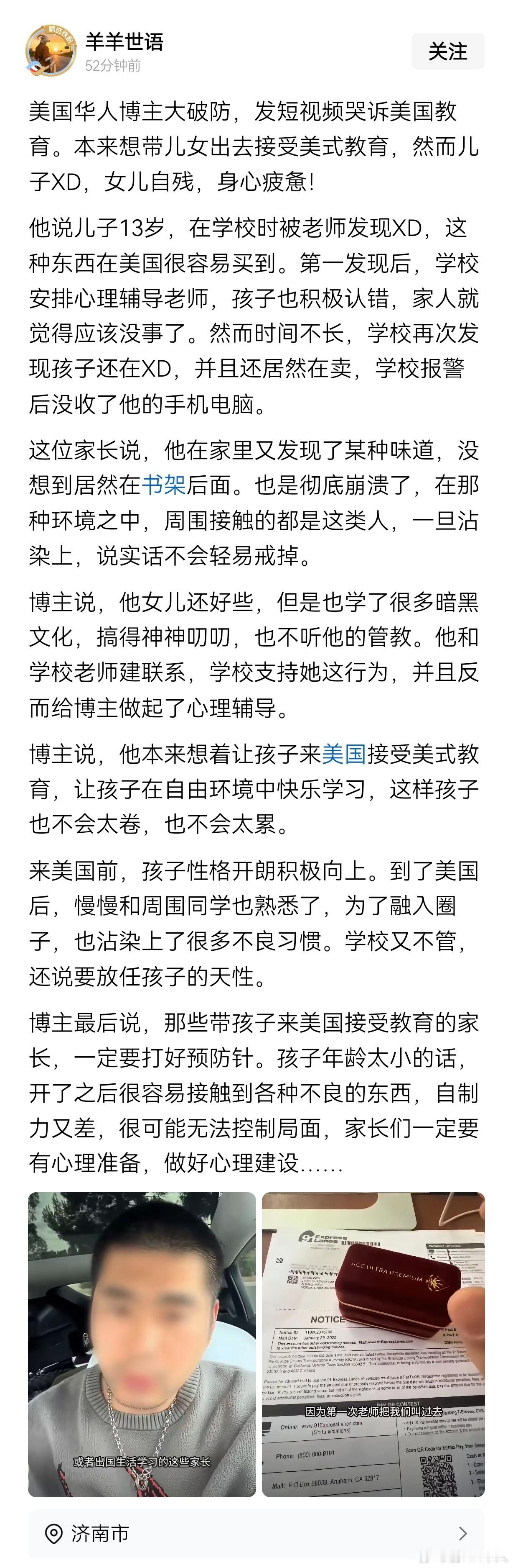 美国华人博主大破防,发短视频哭诉美国教育。本来想带儿女出去接受美式教育,然而儿子吸毒,女儿自残,身心疲惫!杨振宁都不支持中国人的孩子去美国读中小学,他认为那时候孩子自控力还不行,而美国学校乱七八糟(吸毒),果然啊。再下去,两个孩子要被斩杀线了。