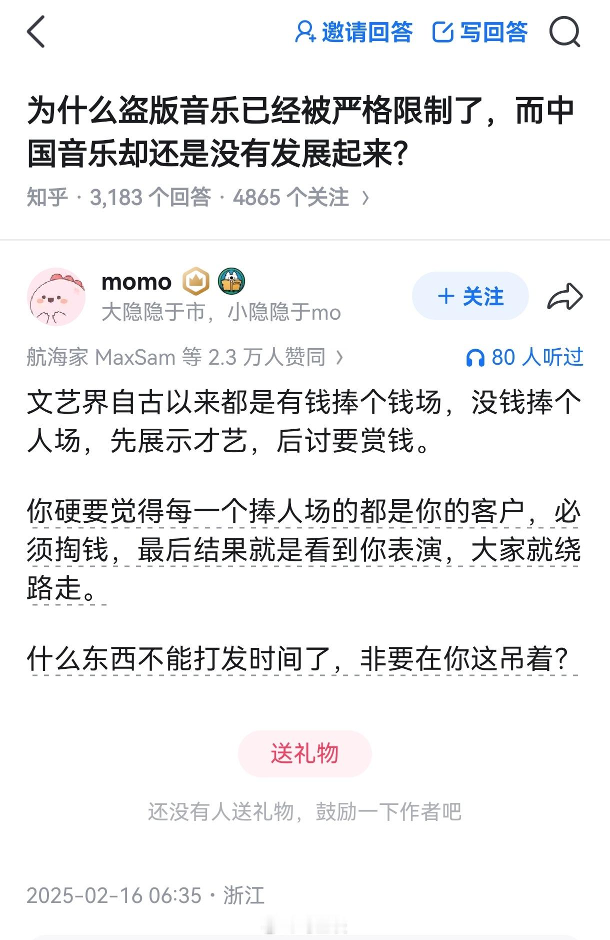 为什么盗版音乐已经被严格限制了,而中国音乐却还是没有发展起来?这个回答说得挺好的,如今各大音乐平台靠着会员制吃得满嘴流油,但真正受害的却是歌曲质量,各大榜单上的歌都没法听,再也无法重现一点开榜单首首金曲的盛况。当下番茄小说就看清了这一点所以现在非常火爆,起点则是盗版网站用户数是正版的几倍所以也不差。另外,我觉得电影市场为什么越来越萎靡的原因也是因为看了一半不想看不能退票,所以越来越没人买账了。