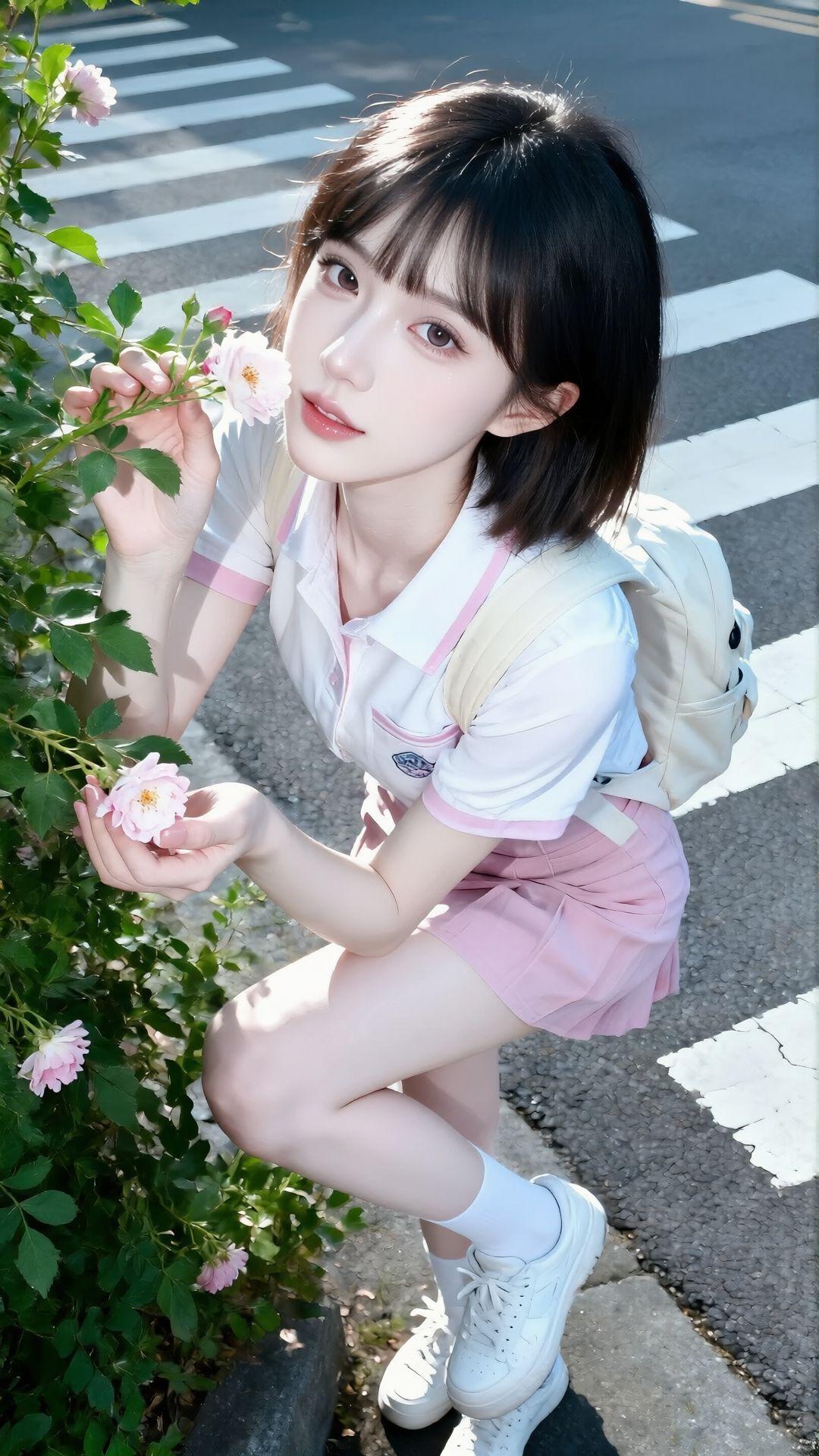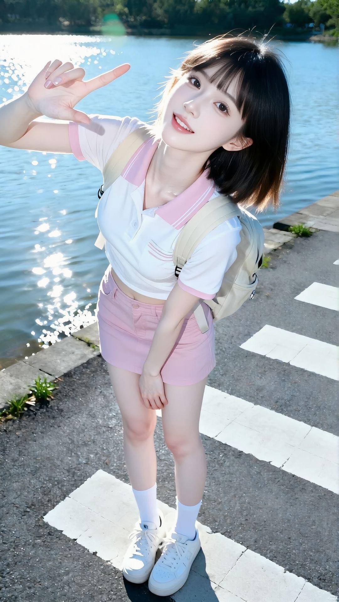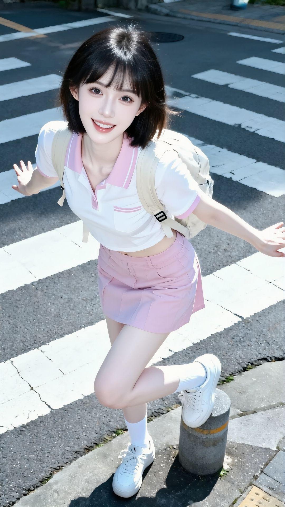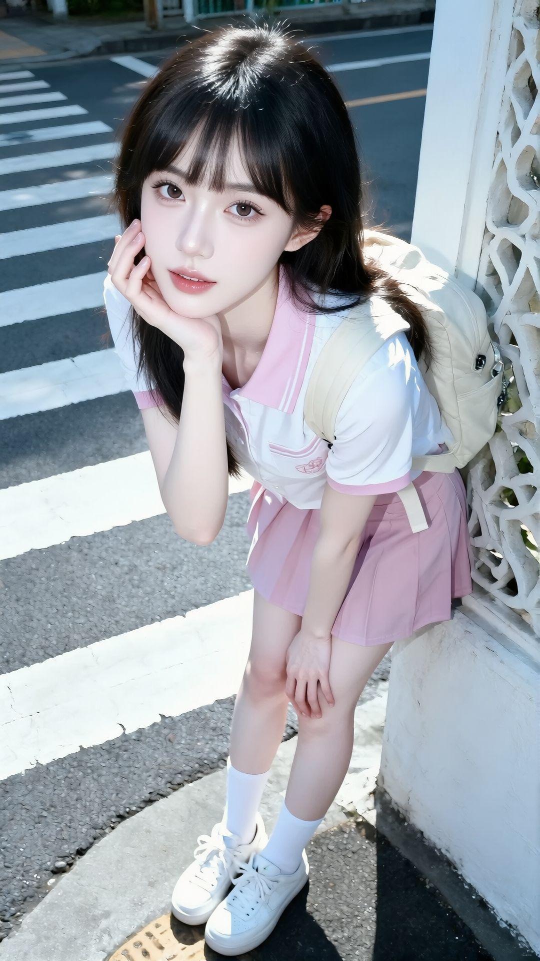 都市时尚美女穿搭,粉色格纹短裙搭配红色上衣,手提包和运动鞋完美搭配!有点肉肉有美