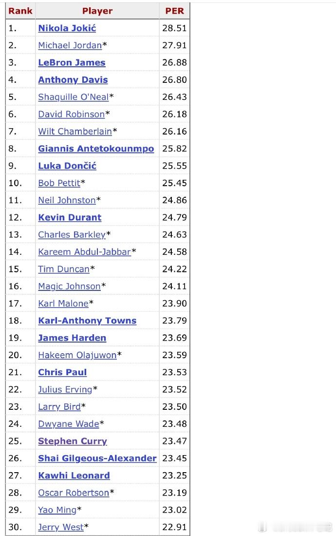 NBA生涯效率值排名前30:1、约基奇:28.51(现役)2、乔丹:27.913、詹姆斯:26.88(现役)4、浓眉:26.80(现役)5、奥尼尔:26.436、大卫罗宾逊:7、张伯伦:26.168、字母哥:25.82(现役)9、东契奇:25.55(现役)10、佩蒂特:25.4511、尼尔·约翰斯顿:24.8612、杜兰特:24.79(现役)13、巴克利:24.6314、贾巴尔:24.5815、邓肯:24.2216、魔术师:24.1117、马龙:23.9018、唐斯:23.79(现役)19、哈登:23.69(现役)20、奥拉朱旺:23.5921、保罗:23.53(现役)22、J博士:23.5223、拉里伯德:23.5024、韦德:23.4825、库里:23.47(现役)26、亚历山大:23.45(现役)27、伦纳德:23.25(现役)28、大O:23.1929、姚明:23.0230、杰里韦斯特:22.91这里面,几乎囊括了NBA历史最伟大的球员,例如媒体评选的NBA历史前十,就有8人出现在其中,乔丹、詹姆斯、贾巴尔、魔术师、张伯伦、拉里伯德、奥尼尔、邓肯。没在其中的,是拉塞尔和科比拉塞尔效率值:18.9科比效率值:22.9NBAnba你我皆主角