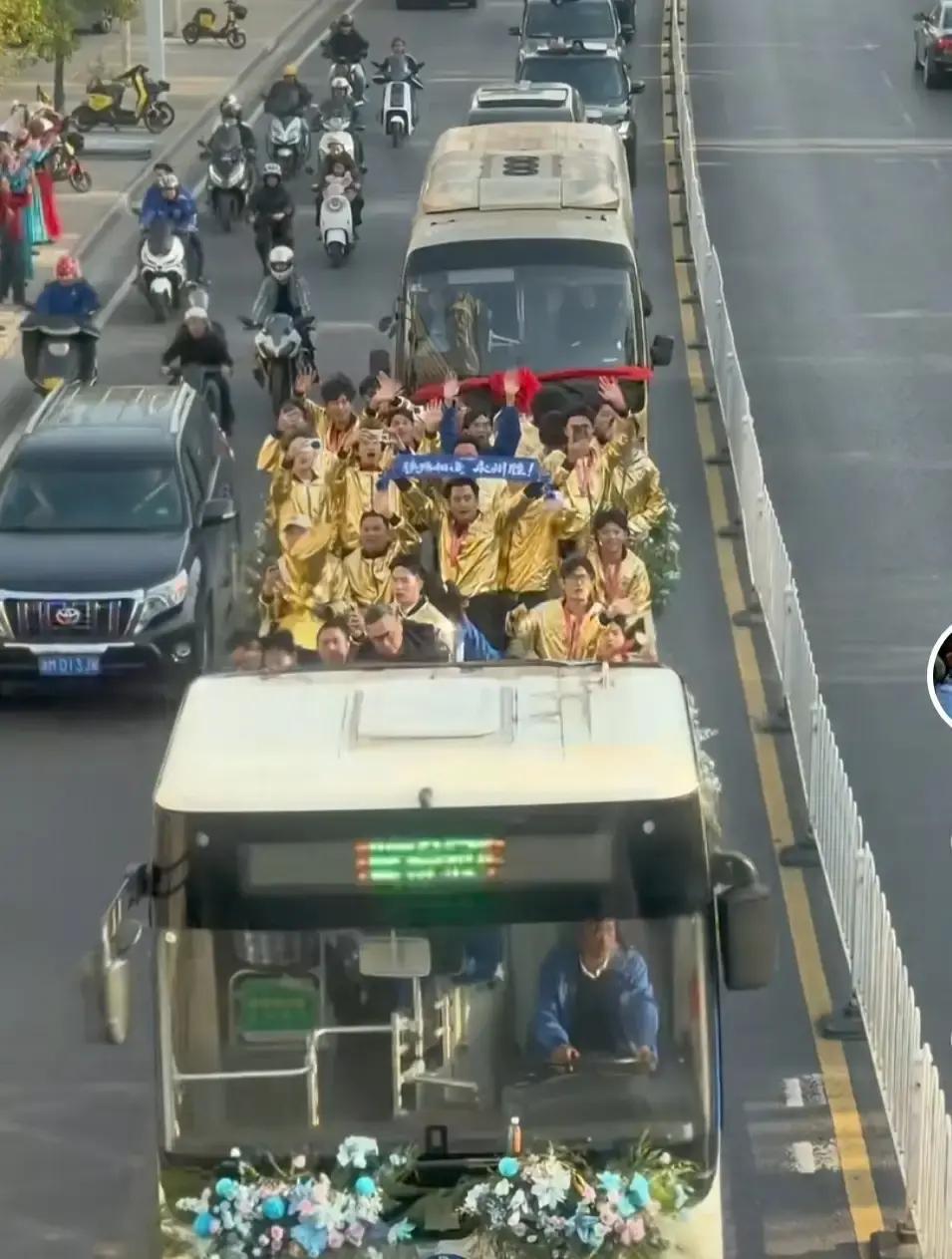 20万人挤爆永州街头 昨晚冷水滩堵成停车场。十辆公交拆掉顶棚,载着女足姑娘从