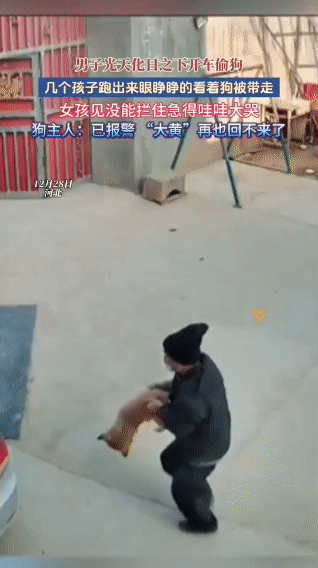 离谱!河北男子白天偷狗,几个孩子拦都拦不住。 河北一村庄里,一桩让人心揪的偷狗事件在白天上演!监控画面里,一名男子毫无顾忌地将住户家的大黄狗强行抱走,动作麻利得像是惯犯,而几个孩子闻声跑出来时,只能眼睁睁看着朝夕相处的狗狗被带上车,最终崩溃大哭,哭声里满是无助和不舍。 狗主人事后心痛表示,已经第一时间报警,但心里清楚,“大黄”大概率再也回不来了。这只大黄狗不仅是家里的宠物,更是陪伴孩子长大的伙伴,平日里温顺黏人,是一家人心里的重要成员。光天化日之下的偷狗行为,不仅偷走了一只狗,更戳碎了孩子的童心,也让邻里间的安全感大打折扣。 偷狗行为向来为人所不齿,不仅涉嫌侵犯他人财产,部分偷狗者使用的毒针、麻醉剂还可能危害公共安全,若被误食后果不堪设想。希望警方能尽快追查到底,也提醒各位养宠人看管好自家宠物,不给不法分子可乘之机。 偷狗案 农村偷狗