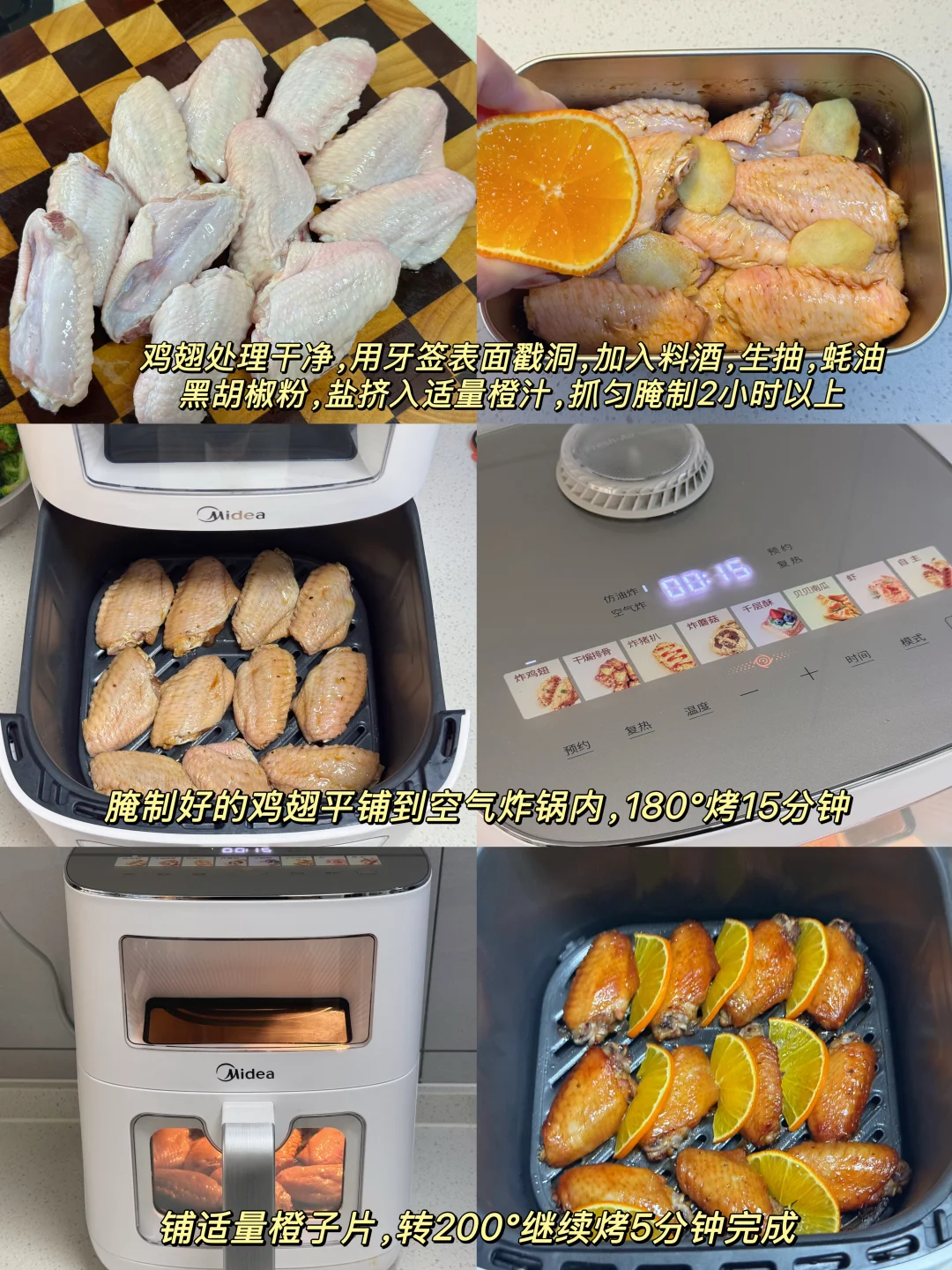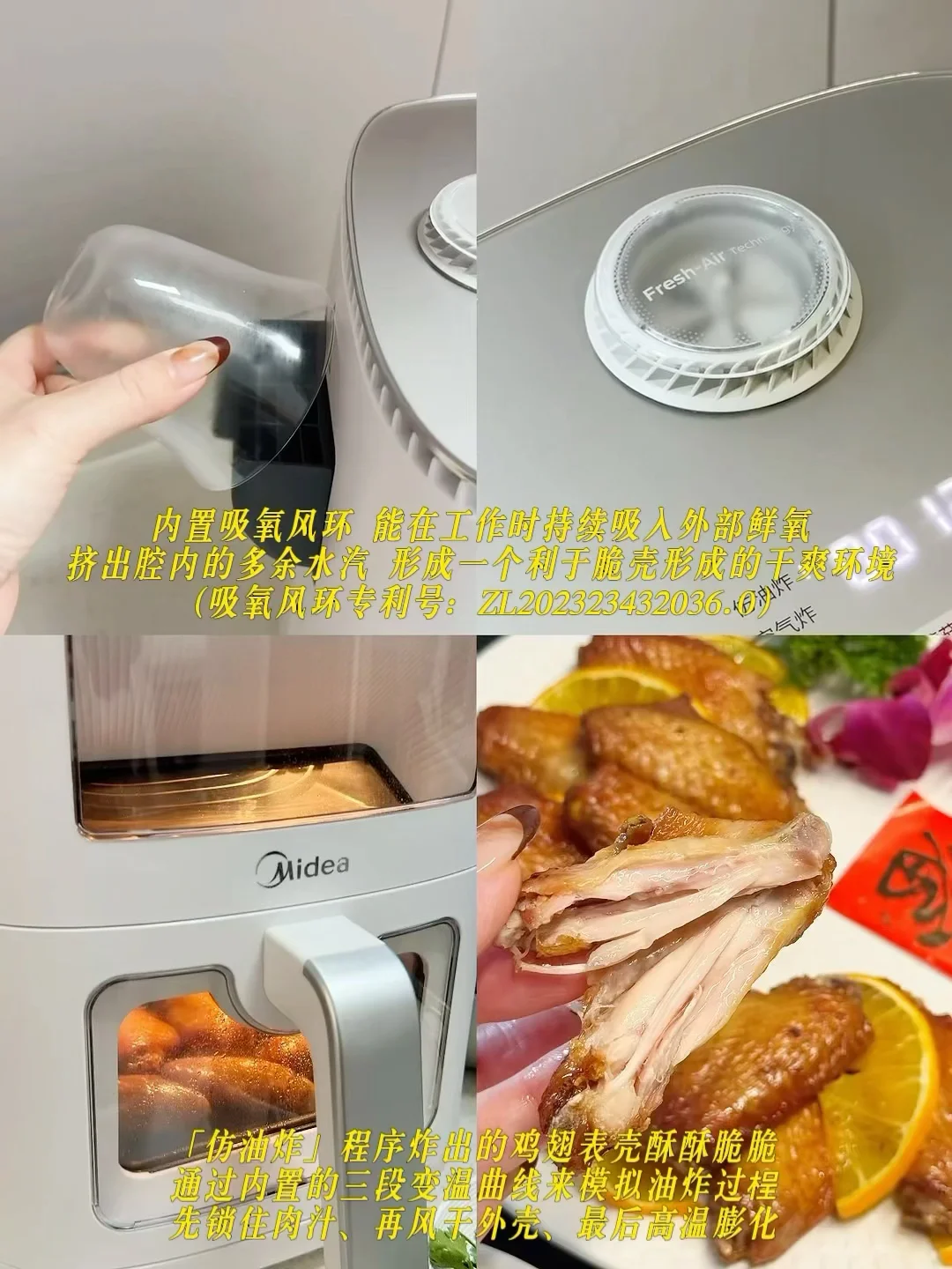 橙香鸡翅:提前用橙汁、蜂蜜与香料腌好的鸡翅,送入美的新风炎烤空气炸锅,专利吸氧新风环便开始发力,每分钟2200转高速旋转吸入鲜氧,配合排湿口快速挤出腔体内的水汽,为鸡翅打造干爽的烘烤环境。免去中途翻面,炸出来的食物外酥里嫩,免去翻面的烦恼。