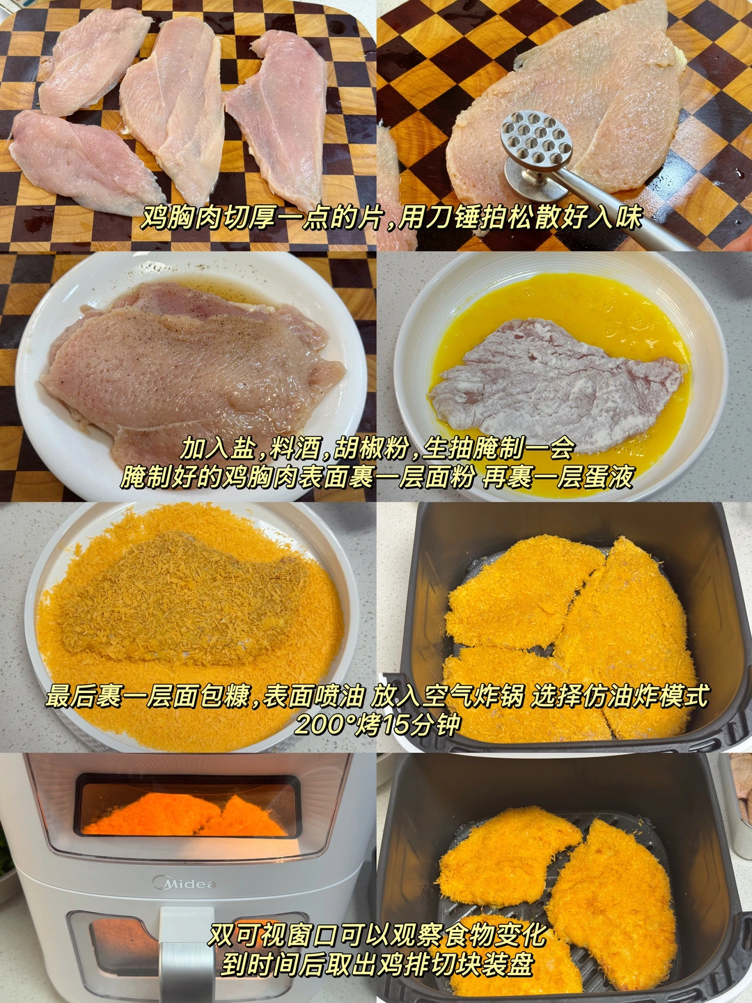 炸鸡排也是非常简单,鸡胸肉选大块的,切厚片先腌制调味放入空气炸锅,上下两个可视窗口都能观察到食物的变化,内置仿油炸模式,模拟真实油炸口感,搭配吸氧风环,高速活氧循环带走多余水汽,让裹粉形成立体酥脆的外壳,堪比现炸口感,却比传统油炸少了超多油脂负担。不用翻面也能受热均匀,切开后肉质细嫩多汁,没有一丝干柴感,老人小孩都能放心炫,妥妥的家宴硬菜担当!