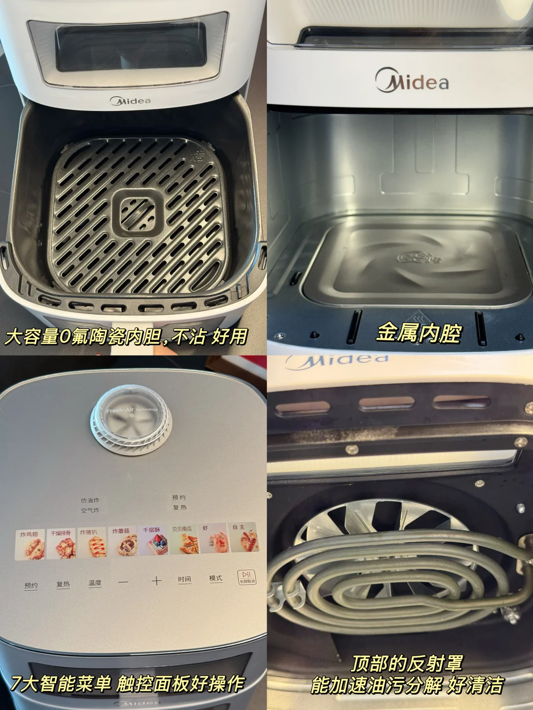让我省心的是 它内置的专利油脂自清洁技术,在高温烘烤下能将油污分解成水和二氧化碳排出,还有0氟陶瓷内胆餐后用水简单冲冲就干净了,清洁省心,有了这美的新风炎烤空气炸锅的省心助力,让厨房小白也能轻松hold住跨年夜聚餐!