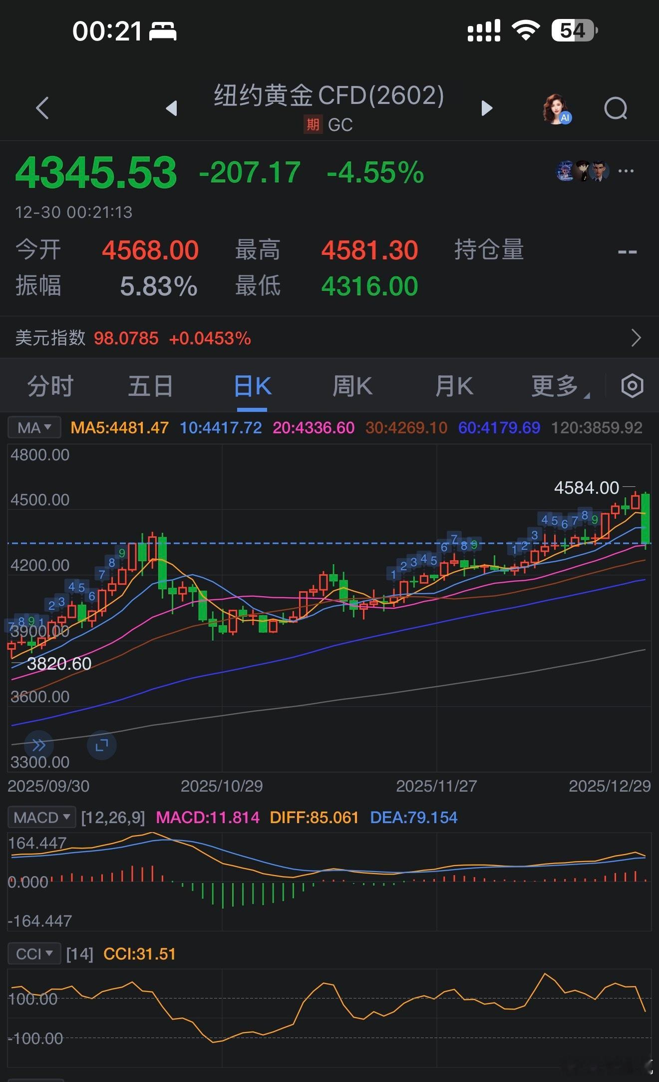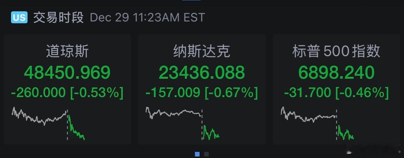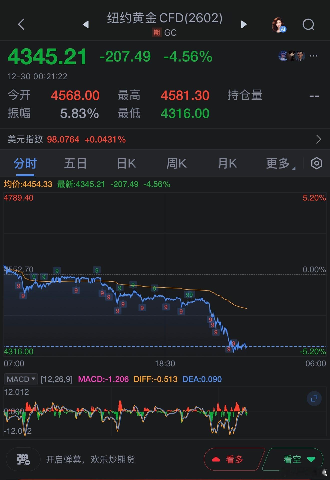 美股重挫!贵金属“闪崩”15%,白银坐上过山车后市何去何从?当地时间12月29日,美股三大股指集体低开,道指跌0.45%,标普500指数跌0.6%,纳指跌0.38%。贵金属市场遭遇“黑色星期日”:美国黄金暴跌近10%,哈莫尼黄金、金罗斯黄金等跌超6%;现货白银更上演“高台跳水”,日内从纪录新高84美元狂泻15%至71.3美元/盎司,抹去全部涨幅;铂金期货跌14%,钯金期货重挫16%,全线崩盘。此次暴跌或与市场流动性危机有关。瑞银警告,近期贵金属价格非理性飙升(尤其白银单日暴涨6%后急转直下),本质是投机资金炒作导致流动性失衡,一旦多头平仓离场,价格极易崩塌。悬念待解:白银是否已见顶?短期技术性反弹能否延续?投资者需警惕贵金属市场情绪化波动风险,重点关注美联储政策转向信号及地缘局势对避险需求的支撑。黄金跌破4500美元现货黄金跌破4440美元黄金