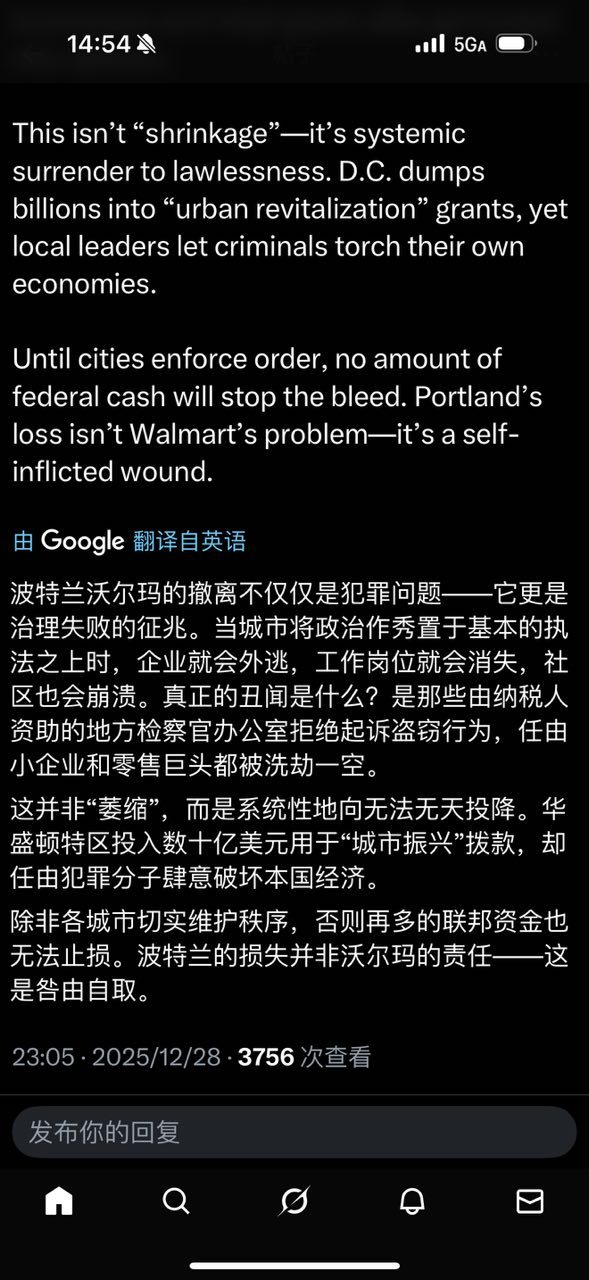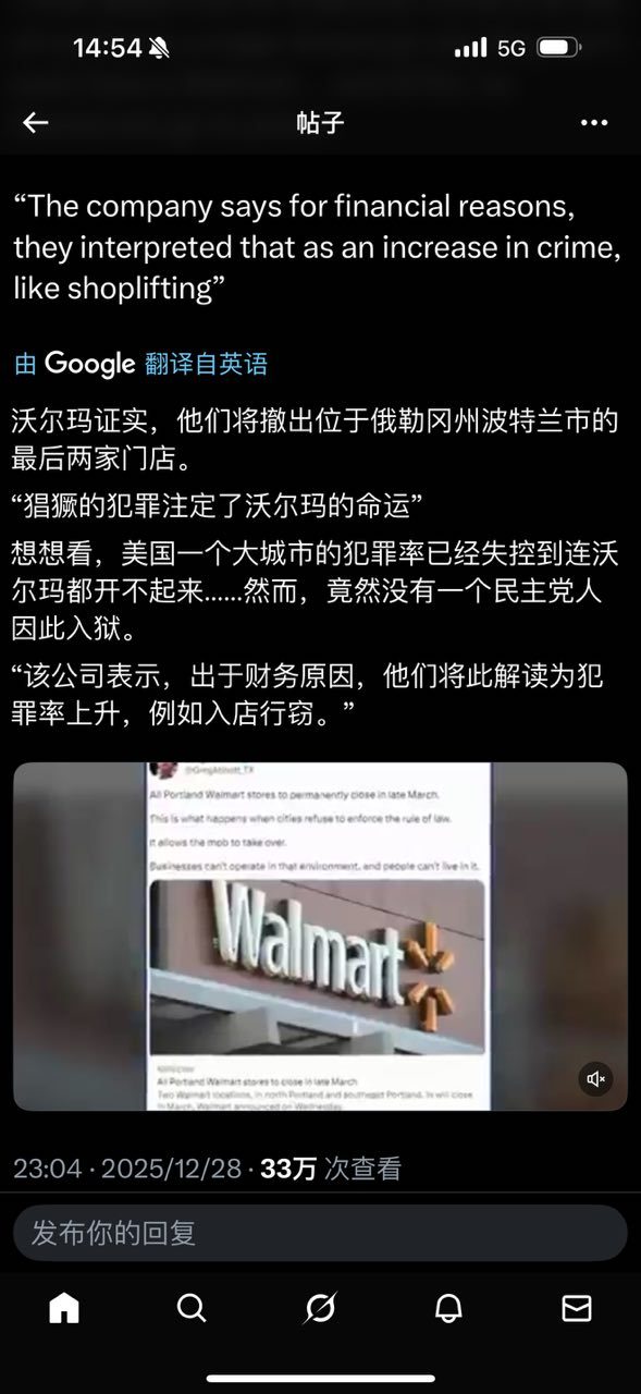 沃尔玛证实,他们将撤出位于俄勒冈州波特兰市的最后两家门店。"该公司表示,出于财务原因,他们将此解读为犯罪率上升,例如入店行窃。"