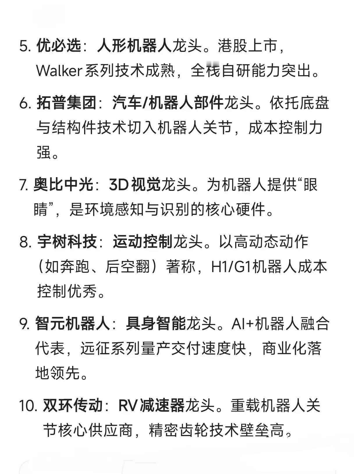 机器人产业链十大核心龙头埃斯顿:工业机器人本体龙头。国产销量第一,拥有全产业链自研能力。绿的谐波:减速器龙头。谐波减速器打破垄断,市占率超60%,是机器人的“关节心脏”。汇川技术:伺服系统龙头。工控与机器人核心部件市占率第一,相当于机器人的“神经”。三花智控:执行器龙头。特斯拉核心供应商,将汽车热管理与机电技术迁移到机器人关节。优必选:人形机器人龙头。港股上市,Walker系列技术成熟,全栈自研能力突出。拓普集团:汽车/机器人部件龙头。依托底盘与结构件技术切入机器人关节,成本控制力强。奥比中光:3D视觉龙头。为机器人提供“眼睛”,是环境感知与识别的核心硬件。宇树科技:运动控制龙头。以高动态动作(如奔跑、后空翻)著称,H1/G1机器人成本控制优秀。智元机器人:具身智能龙头。AI+机器人融合代表,远征系列量产交付速度快,商业化落地领先。双环传动:RV减速器龙头。重载机器人关节核心供应商,精密齿轮技术壁垒高。