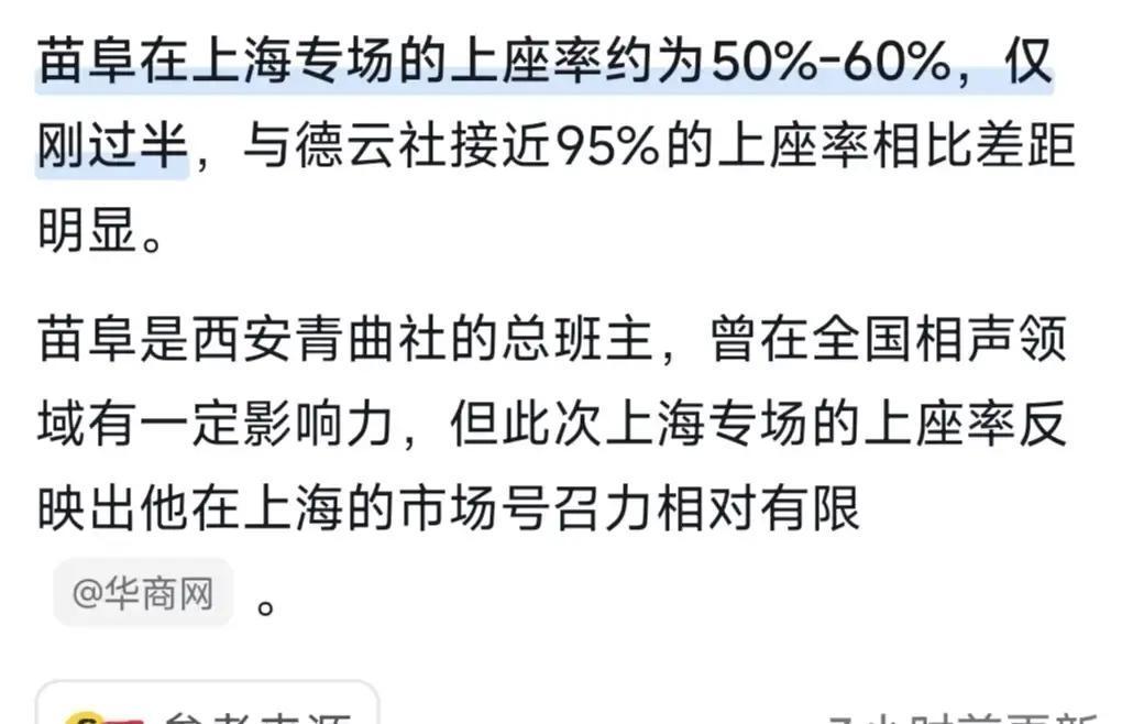 郭德纲上海场卖光,苗阜剩半座 昨天两场相声,同在上海,一个挤爆,一个空半。奔驰文化中心18000座,郭德纲票卖光,黄牛把1880炒到3000。东方艺术中心1200座,苗阜只卖出700,门口还挂买一送一。 去年上海演出报告说,相声场次涨四成,德云社占一半多。票贵也抢,因为一年就一回。苗阜平时在西安,上海粉丝少,临时来,宣传没跟上。 我查了数据,德云社商演占市场快七成。青曲社想靠打折冲人气,结果观众还是认老郭。这事提醒我:名气不够,降价也难救。