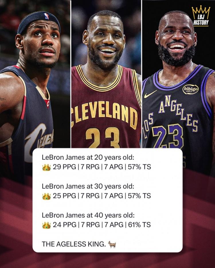 詹姆斯各年龄段数据: 20-29岁:场均29分7篮板7助攻,真实命中率57% 30-39岁:场均25分7篮板7助攻,真实命中率57% 40岁:场均24分7篮板7助攻,真实命中率61% 美国媒体计算的数据只是大概,并没有完美的“7篮板7助攻”出现,三个年龄段分别是“7.4篮板7.1中”、“7.8篮板8助攻”、“7.1篮板7.4助攻”。 正如詹姆斯生涯从未做到单场27+7+7一样,这个数据不可能如此完美。 而综合到詹姆斯的整个生涯,目前场均26.9分、7.5篮板、7.4助攻,和他以往阶段数据区别不大,也是詹姆斯生涯稳定性的表现。 这里面比较难的是适应性,因为詹姆斯03年进入NBA,打过中锋时代的尾巴,打过四大分卫,还有小前锋盛世,以及如今的小球时代,联盟比赛的风格已经变得老球迷都不认识了,但詹姆斯还是能有所表现,这个能力确实有点离谱。