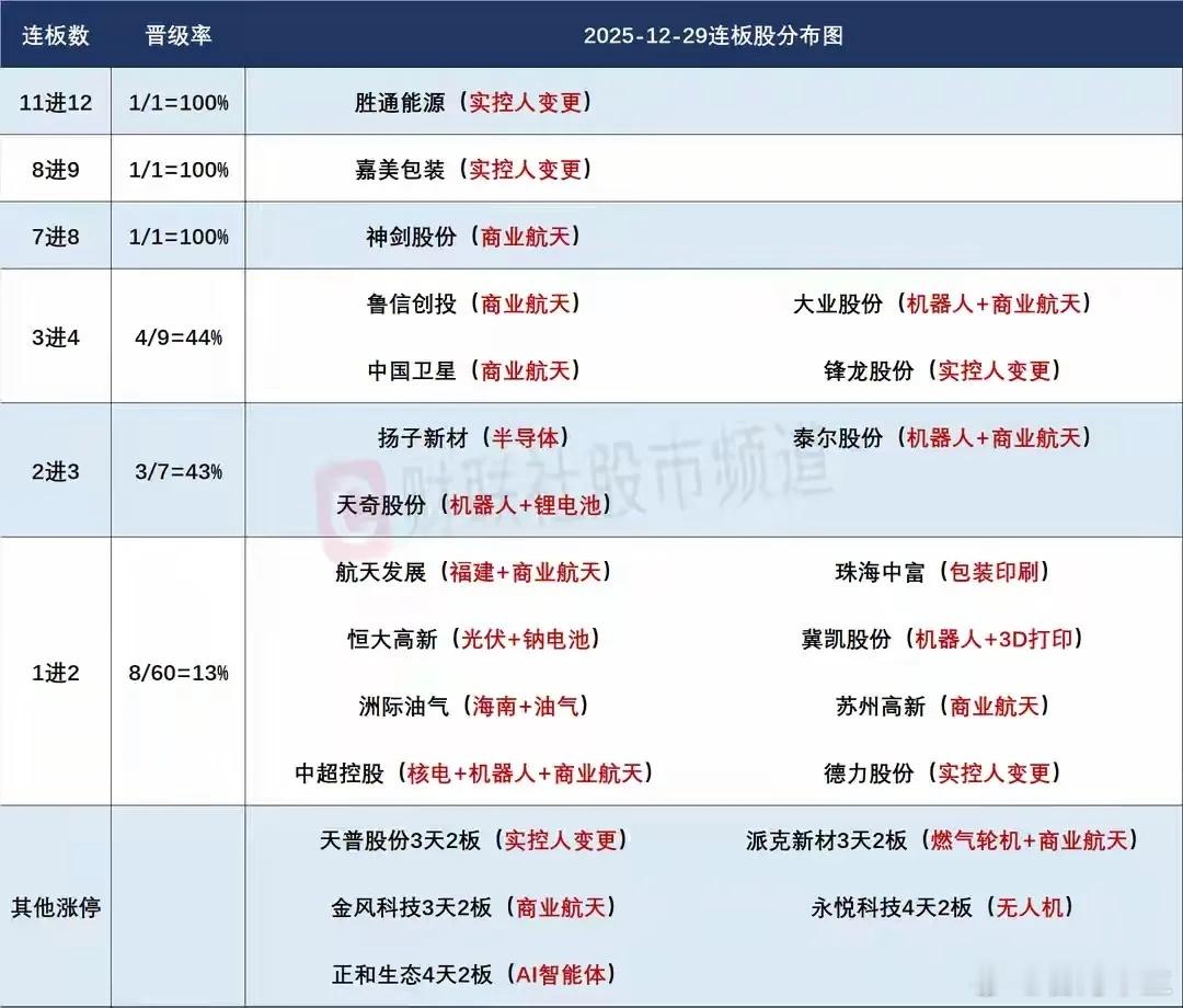 12月30日盘前预案:节前出金日注意大盘回撤风险,胜通停牌或许会影响短线高位情绪!1、25年还有最后两个交易日,昨天沪指艰难完成了9连阳的目标,但是可以看到整个市场走的非常纠结,再加上今天是节前最后一个出金日,在市场完成既定目标后,大盘整体是有回撤需求的,所以今天的市场大概率很难有资金继续去强势护盘,再加上连续的上涨后,市场是有回撤需求的,所以今天的市场很可能会出现明显回撤,但是对于指数来说,整体趋势并不用过于担心,短暂的回调会更利于之后更好的反弹!2、胜通最终还是停牌了,它虽然是重组个股,但是在严重异动开板放量后依然能够连续走出两个放量涨停板,这样的表现是非常强势的,之前只有天普有过类似表现,而它也最终像天普一样被关小黑屋,这对于市场高位抱团股肯定会产生影响,特别是昨天刚挑战严重异动的神剑,所以今天早盘神剑的表现是高位抱团方向最大的看点!神剑强势晋级8板挑战严重异动,盘后毫无疑问进入了重点监控名单,那么它开盘的方向选择就非常重要了,首先它竞价就不能出现明显负反馈,红盘开是最基础的表现,如果连红开都不能保证,市场的抛盘肯定会疯狂兑现,其次,它开盘能不能顶住分歧是一大看点,如果前3分钟是明显大幅下杀,那么这只个股同样就是结束的标志,那么短线就是要及时抢跑,毕竟大有、海王严重异动高开后都是开盘后直接负反馈表现,所以对于神剑来说,开盘资金的认可非常重要,如果没有资金认可,那么就是结束的预期,反之,如果开盘就有资金强势去拉升冲板,不排除它走出持续强势表现!对于神剑来说,如果商业航天方向负反馈明显,它也许开盘也会出现大的负反馈,但是它能不能走出类似合富8进9的表现就看市场盘中商业航天方向的修复力度了,如果修复够强,它说不定会有类似合富的逆天表现!商业航天昨天虽然有分歧,但是可以看到,前排依然走出多只个股,再加上后排有新的补涨出现,所以这个方向的持续性是非常得到资金认可的,而且多数游资大佬选择在这个方向扎根格局,这或许说明这个方向在未来一段时间内仍然是市场最强主线,而短线最重要的是去弱留强,高位颓势后进行高低切换去寻找新的低位新龙!卫星4连板突破千亿市值,这只个股没什么好说的,它是商业航天这波行情中最强的趋势中军,它能走出4板或许会拓宽这个方向的思路,那么商业航天一些低位辨识度高的大盘股或许会是资金高低切换的下一个可能,所以对于卫星来说,它只要不大幅下杀,板块的整体趋势就能够得到保证!泰尔是唯一的三板个股,昨天商业航天中位股批量兑现,泰尔在整体位置偏低的情况下走出来是非常不错的,再加上它机器人方向的加持,所以它三板的放量分歧形态并不算差,隔日如果商业航天继续分歧,它的表现是可以重点关注的,毕竟是明显的小盘股,股价和辨识度都不错,一旦高位兑现,不排除它能成为这一方向的补涨,所以它早盘能不能迅速强势上板是一大看点!中超的一字板确实很意外,这样的话,它的二波表现就非常值得期待了,它能不能走出类似龙洲的二波强于一波的表现,今天的表现至关重要,T字板可能是最佳选择,就看资金竞价会不会继续去强顶了,毕竟昨天是超强一字板,竞价不开一字的话抛压反而很难有资金去承接!航发是商业航天最具辨识度的情绪个股,只要它竞价足够强,对于商业航天的促进就非常大,它就能够继续趋势上行,一旦它开盘就低迷,那么整个商业航天大概率就是大分歧的格局,所以这只个股是商业航天整体走势的风向标!雷科是陈小群等多个游资强势做多的高低切换个股,如果高位出现明显分歧,这只在高位持续横盘的个股或许会有二波表现,毕竟小群曾经这样做过通宇,雷科或许会是通宇的另外一个翻版,所以它开盘能不能强势拉升上板非常值得关注!金风的反包板非常漂亮,它的逻辑是持有蓝箭航天股权,再加上卫星能够走出4连板,这只个股如果能够走出趋势性,还是非常有看点的,所以一旦卫星趋势放缓,它或许会是商业航天最适合接班的中军,毕竟它整体还算低位!3、机器人方向是除了商业航天外另外一大看点,锋龙从表现上看,继续大单一字无悬念,昨天同样有优必选概念的天奇大分歧晋级,如果今天商业航天继续分歧,机器人或许会继续有资金流入,那么天奇就有弱转强的概率,对于天奇来说,在连续两个一字的情况下能够换手晋级是不错的表现,隔日如果能够继续跟板块共振,或许仍然有看点!4、拓维在昨天出现强势放量首板,如果今天商业航天分歧,算力科技会不会有资金持续流入值得关注,所以拓维能不能在早盘弱转强是一大看点,如果没有,那么这个方向就可以直接放弃了!5、数字货币在利好的情况下有所表现,但是不管御银还是翠微,涨停都比较烂,它们更多的还是需要板块支撑,隔日如果早盘板块没有强势共振,它们也就是一个溢价的结局,反之,如果板块出现共振上涨,那么就非常值得重点关注了!本文只限于分享和交流,不构成投资建议,股市有风险,投资需谨慎!