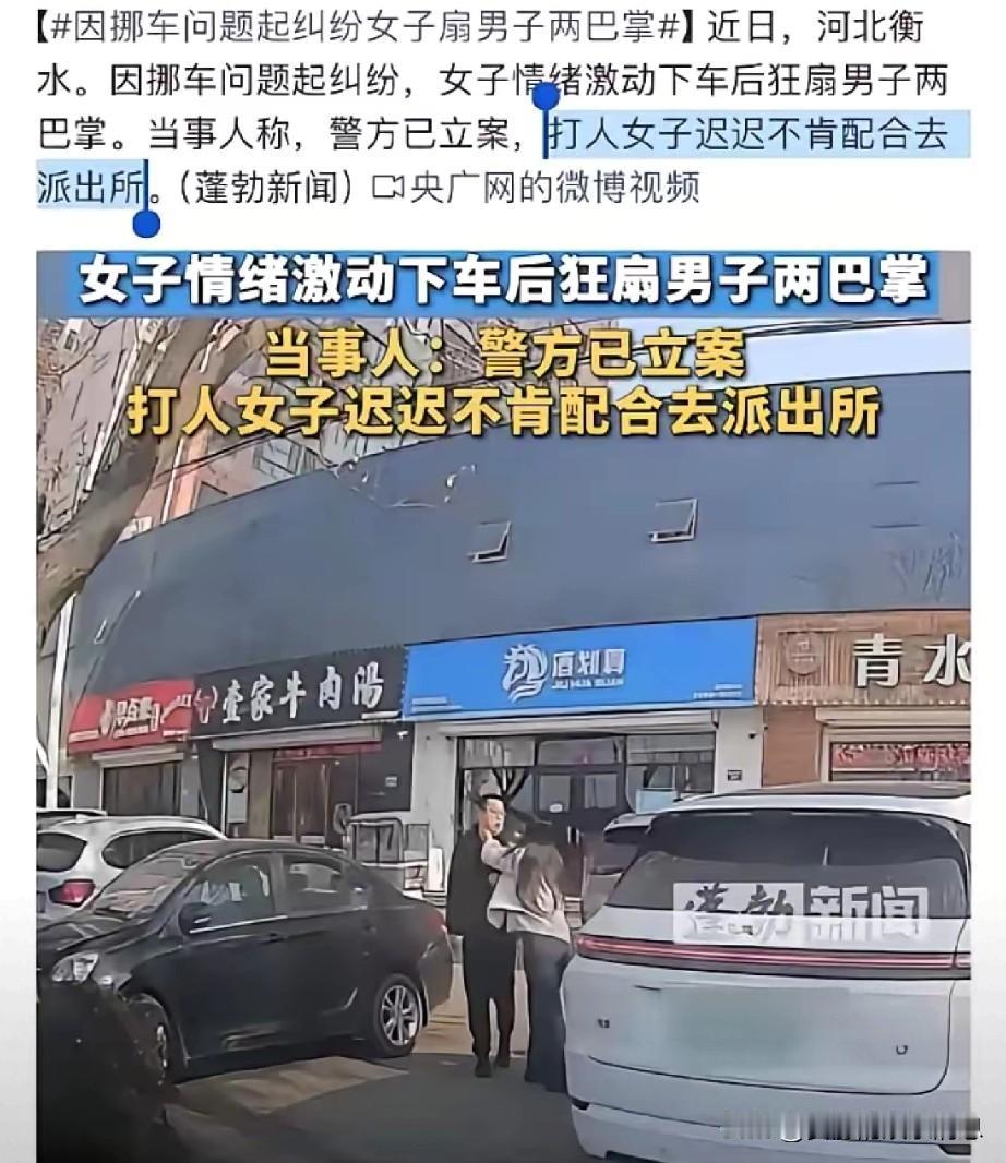女子与男子驾驶的两辆车发生碰擦,二人下车后发生争执,女子扇了男子几个耳光。男子随后报警,民警赶到后处理完现场,女子却害怕离开了,男子独自一人在派出所做了笔录。 民警告知男子,因打人属于侵犯他人身体权利的行为,属于刑事案件,已立案侦查。网友看到此事后,有的劝男子算了,有的说打人就要付出代价的,还有的说打人也要看情节轻重,有的说打人不打脸有个说法吧。 也有说打人就要拘留的。警方表示如果女子不愿意到派出所做笔录,可以传唤她到派出所做笔录,如果拒绝配合民警工作,那就有可能强行带走女子到派出所做笔录。 警方提醒,遇到纠纷时,言语不和甚至打人打伤的,一定要报警处理,不要私下和解,更不要怕麻烦,影响自己合法权益的事情一定要坚持走司法程序,不要放弃,自己的诉求要明确,保留好证据很重要,如行车记录仪视频、监控录像等,能证明自己受伤的照片,医院的就诊病历等。