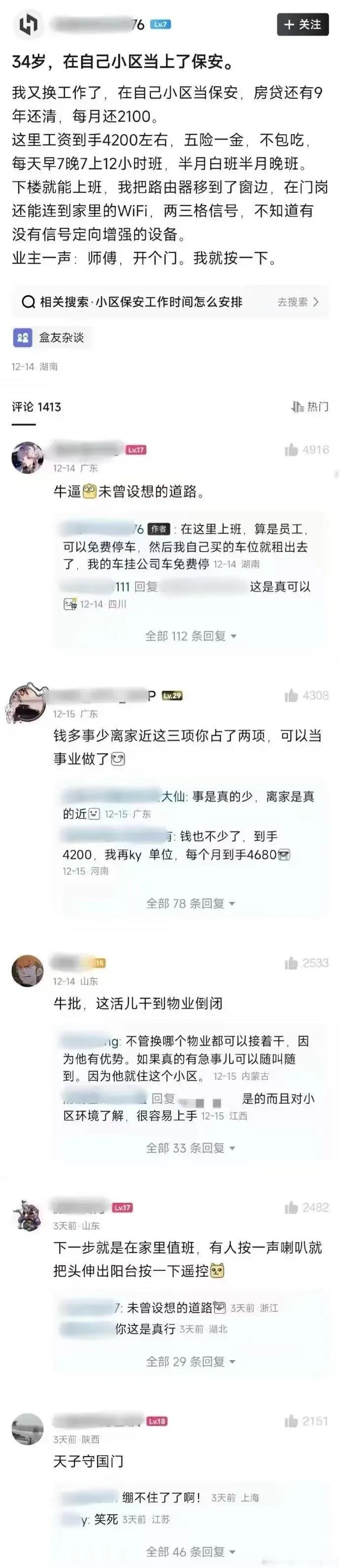 我的个老天啊! 还能如此操作,也是个人才啊! 房贷还有9年,每月还2100, 42岁失业后,就在自家小区当保安,每月到手4200,还有五险一金~ 下楼就能上班,还把家里的网络拉到了门岗,信号一般,但可以用~ 业主一声开门,他就按一下开门键,完美! 哈哈哈,太牛了,在自家小区能找到这么美的工作,运气挺好的啊祝福一下!! 著名国家问题专家卢克文看到之后,也转发了,他说,这也行??[大笑][大笑][笑哭][笑哭][打脸][打脸][比心][比心]