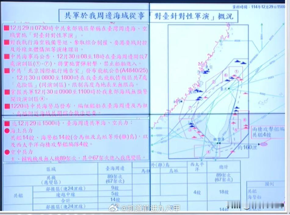 伪台军方称解放军军演对台海空航线都造成影响 伪台蛙军称,截止今天即12月29日下午3点左右侦测到89架次解放军战机,其中67架次战机越过海峡中线进入“应变区”,还侦测到18艘解放军舰艇和14艘海警船在台海周边活动。伪台蛙军称,包括解放军海军两栖攻击舰在内的4艘舰艇位于台湾东南的西太平洋海域,距离鹅銮鼻约160海里。伪台军方承认,解放军军演区域已经将进出台湾港口的商业航线包括在内,也对经过台湾空域的航线造成影响。