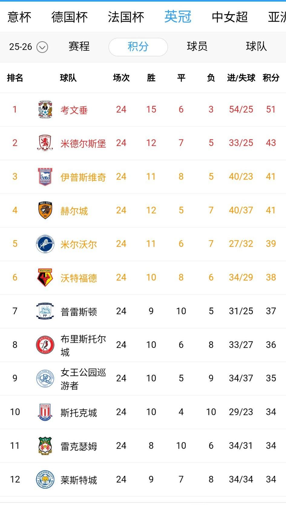 英冠第24轮结束,领头羊考文垂被第三的伊普斯维奇主客场双杀,领先优势缩小到10分,兰帕德暂时没有焦虑。 由于第二的米德尔斯堡输球,第三与第二只相差2分。 莱斯特也赢了,距离附加赛区仅仅1分。谢菲尔德联队赢球基本逃离降级区。