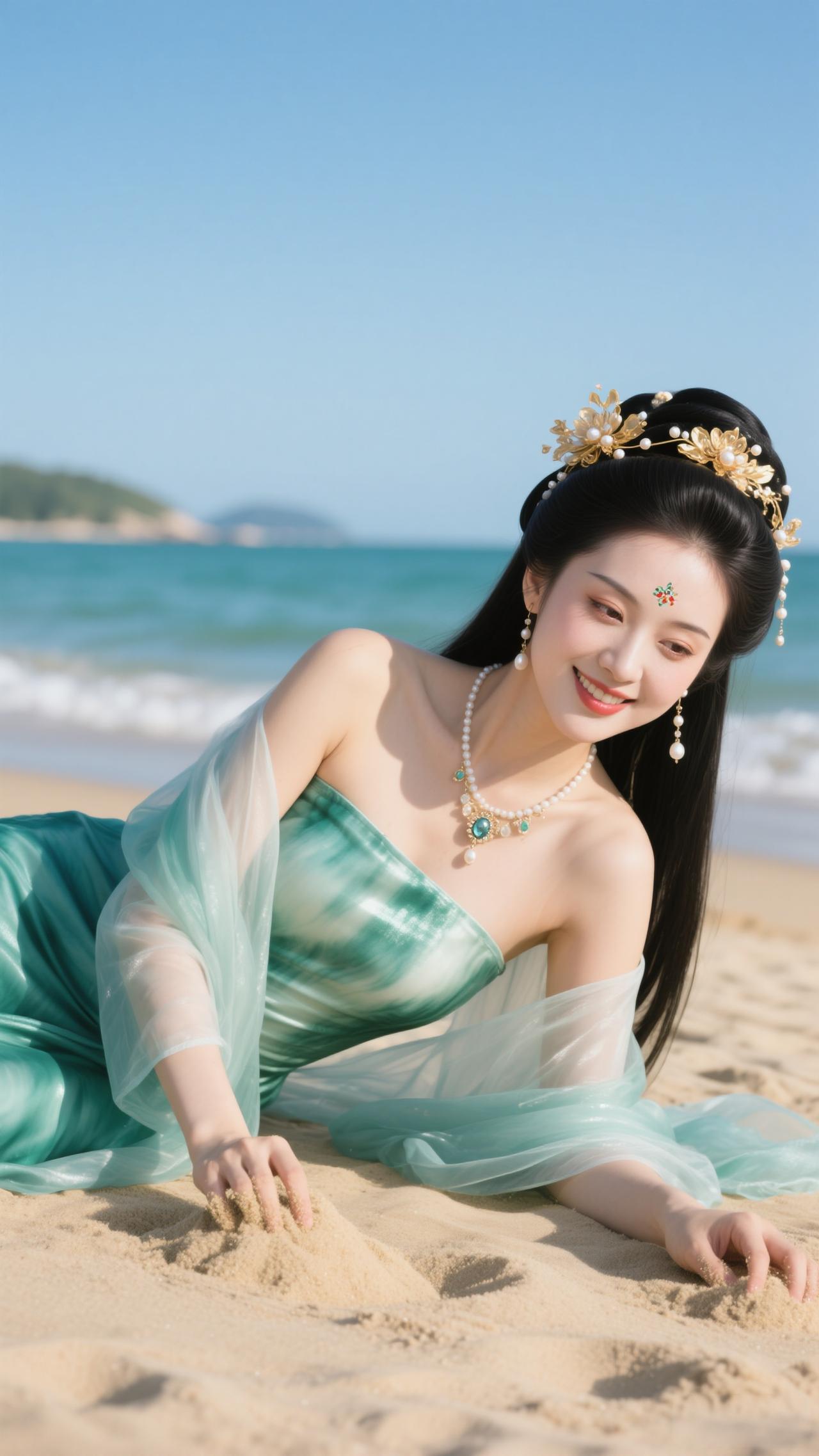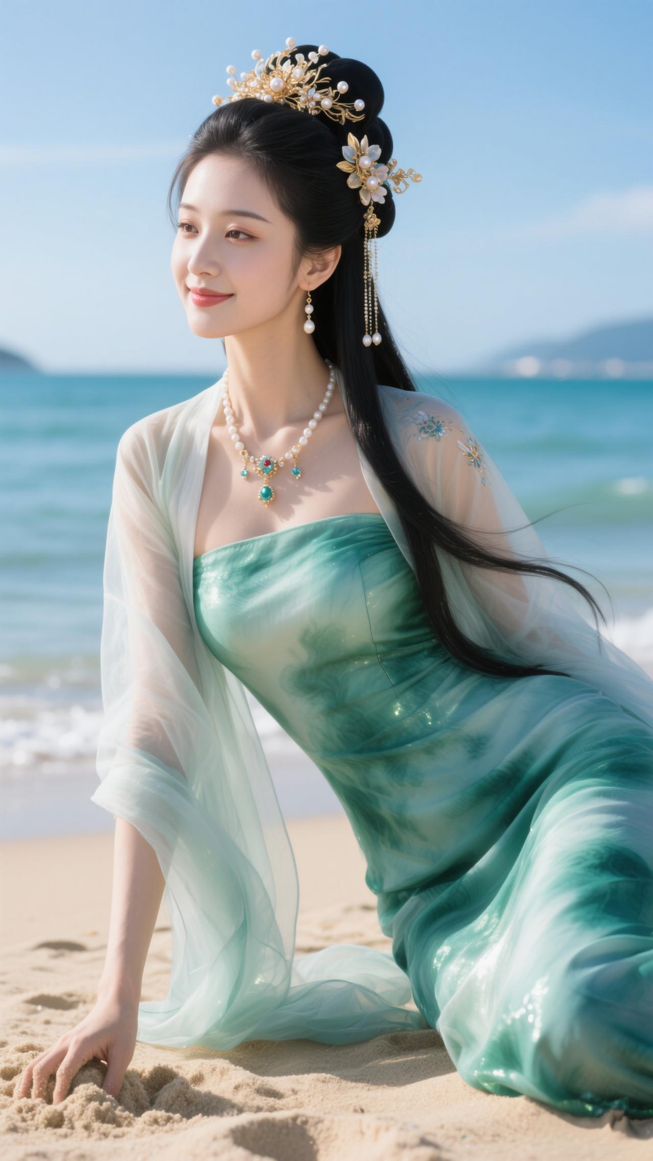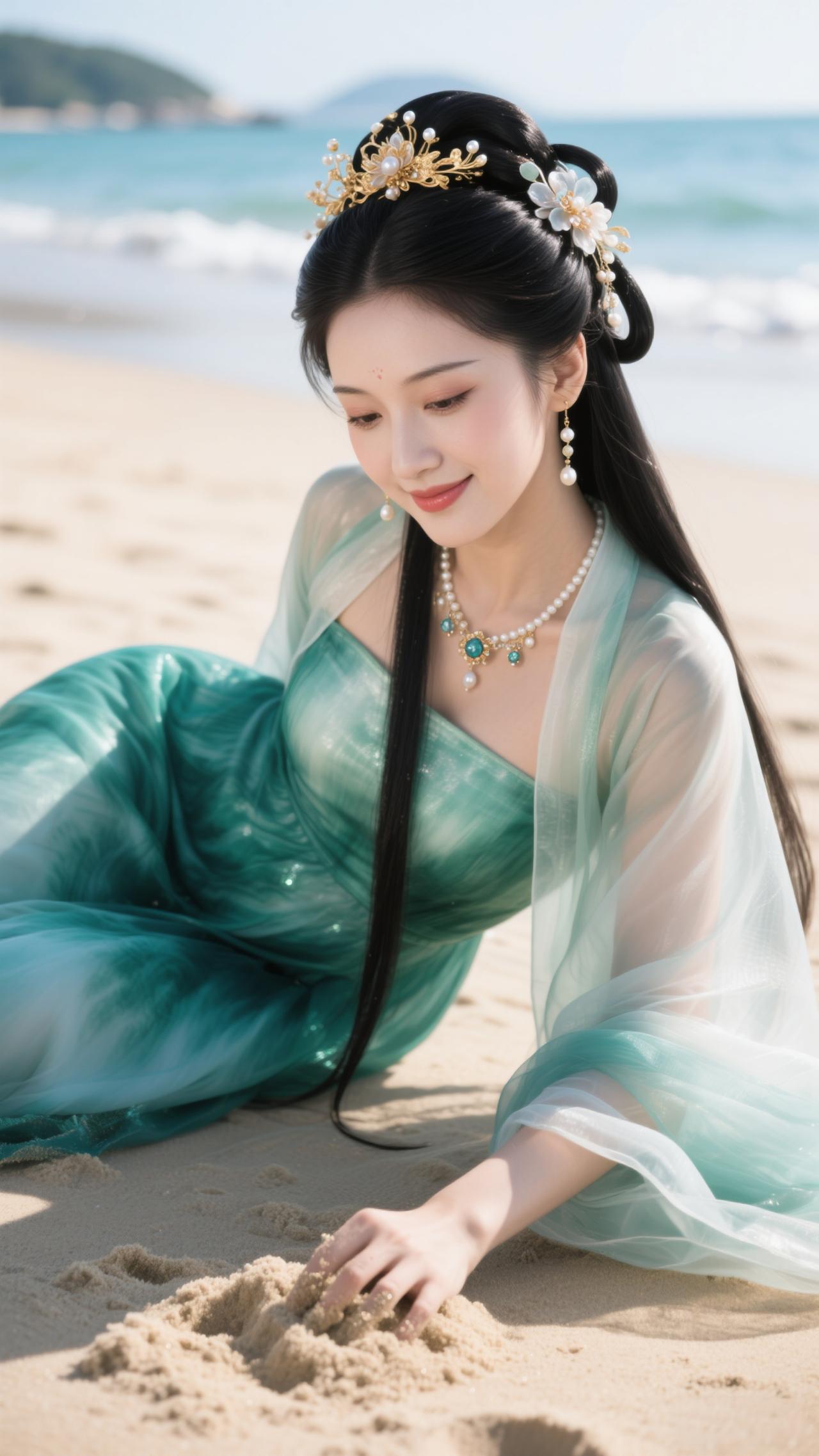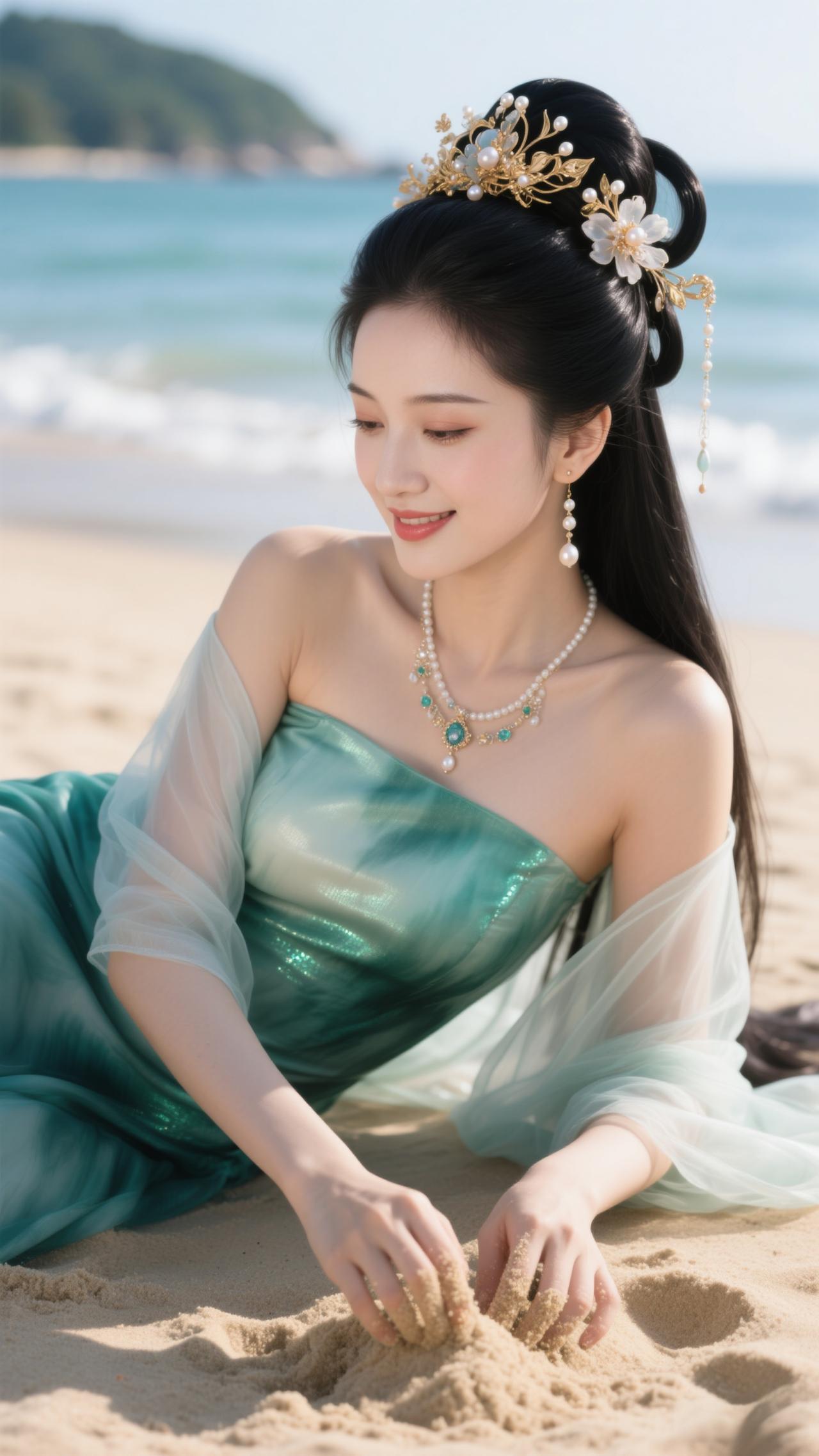 碧海漾清辉,沙岸凝翠影,佳人着青绫罗裙卧于银滩,金簪垂珠摇落海风,青丝漫卷如墨浪。指尖轻触细沙,眉眼间漾着山海的温柔,恍若深海走出的鲛姬,将碧波揉作衣袂,把潮声藏进鬓边。